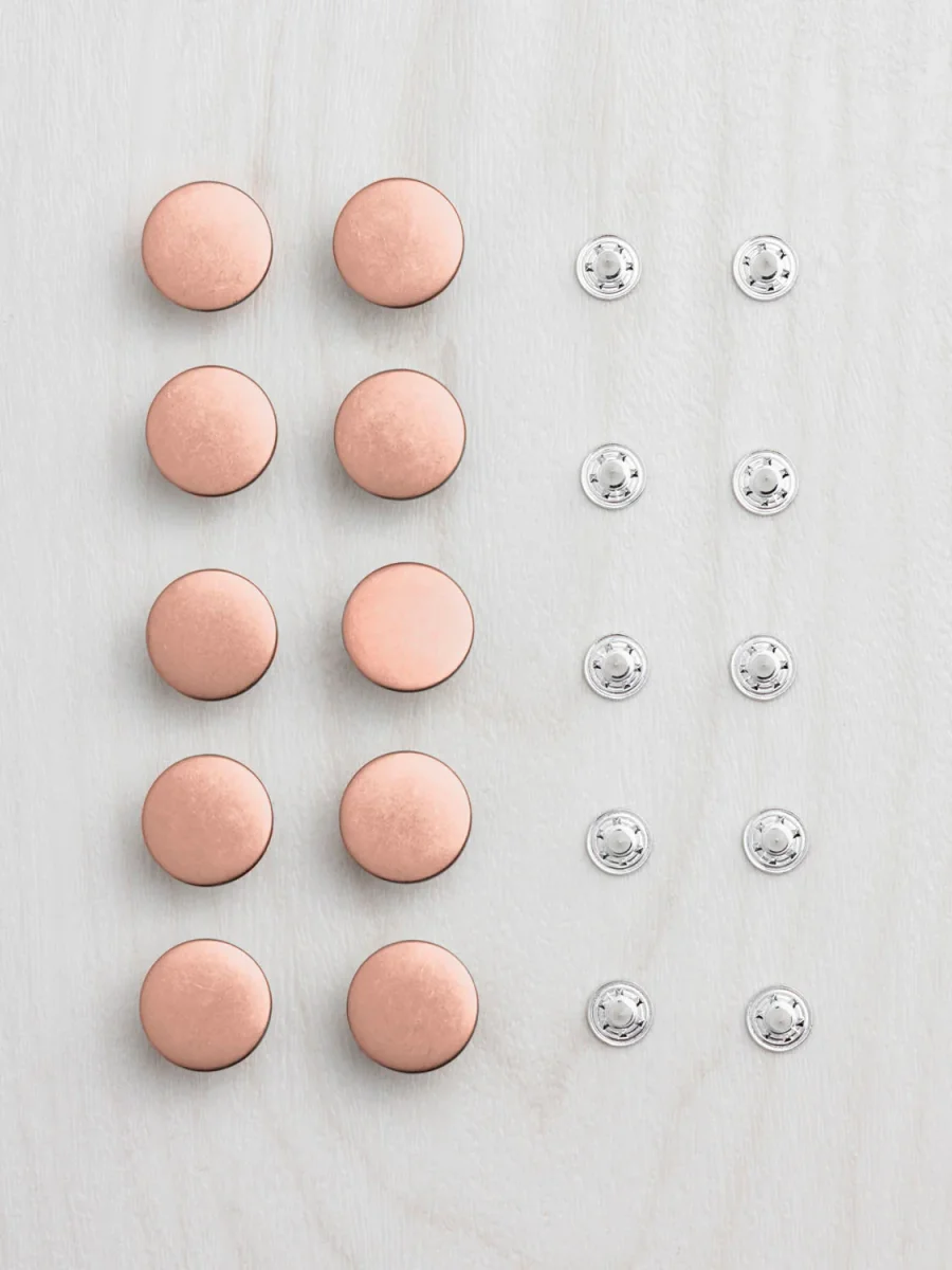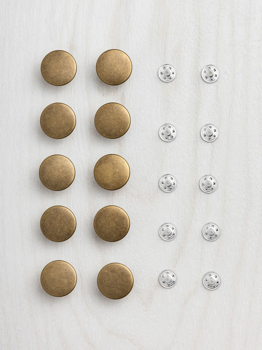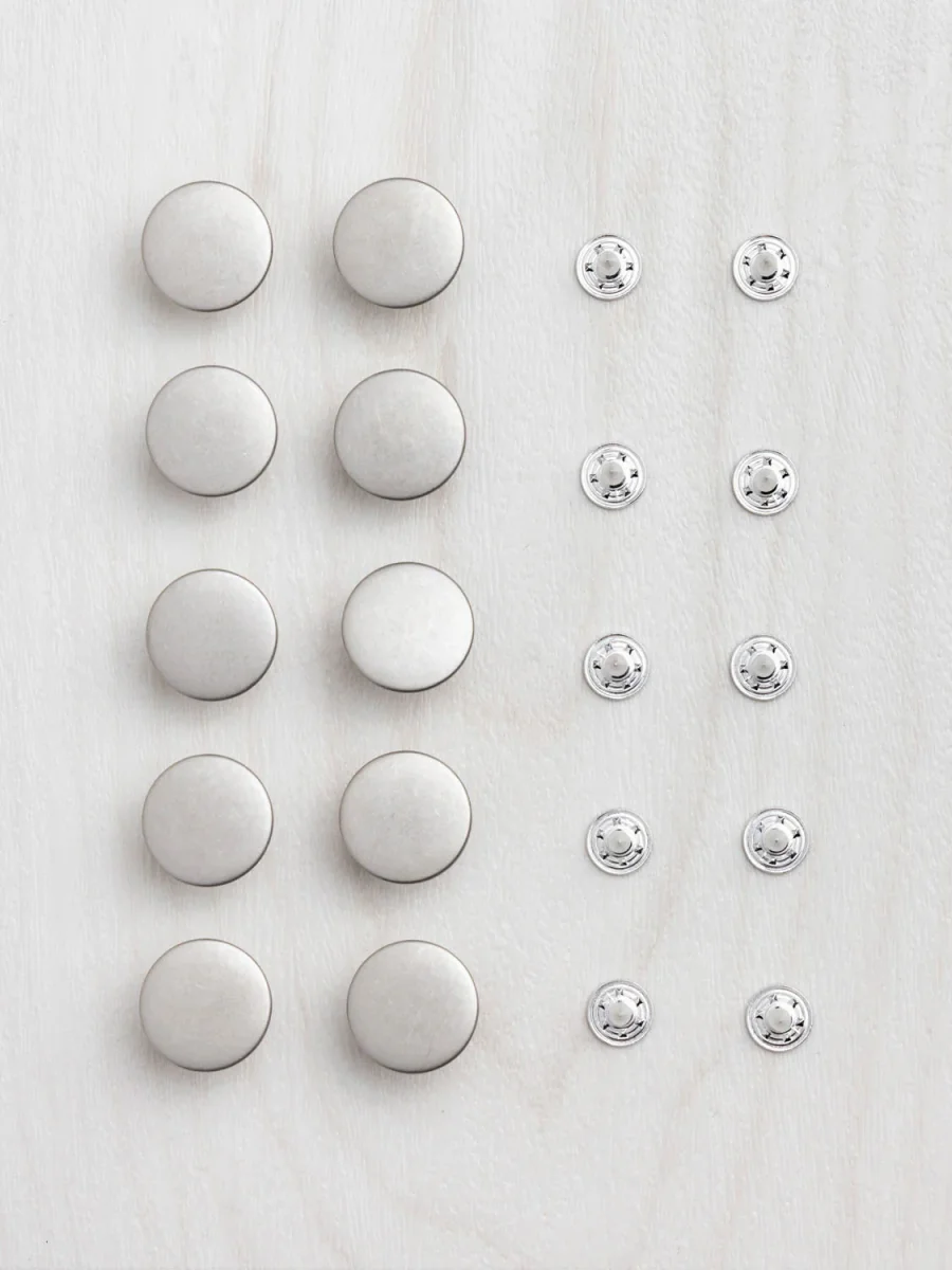 Whether for jeans, overalls, jean jackets, or anywhere else you need a nice sturdy button, we’ve got you covered. The same buttons we include in our jeans kits, these attach securely with a ribbed metal shank, and can be installed with a standard hammer and any metal surface (like our cute lil’ mini anvil!) If you’re looking for help installing them, check out this handy tutorial.