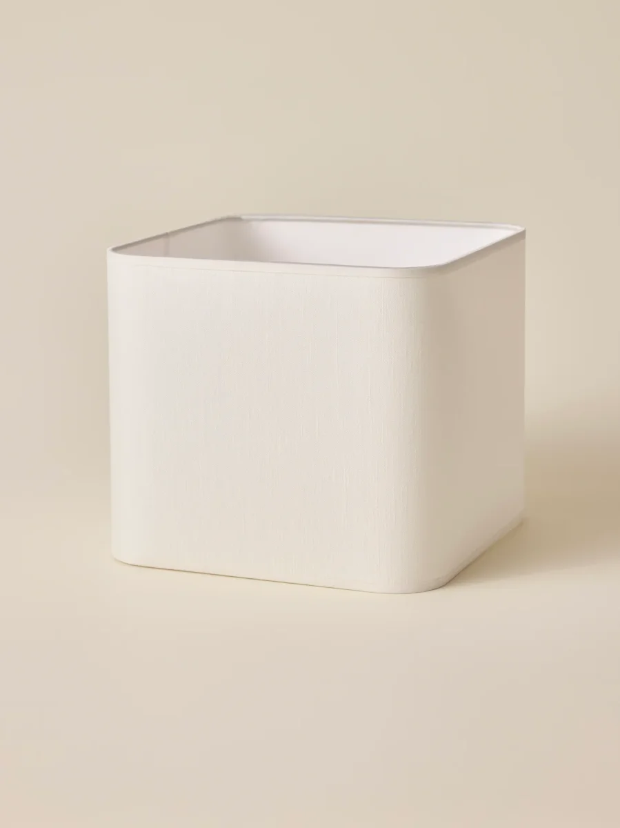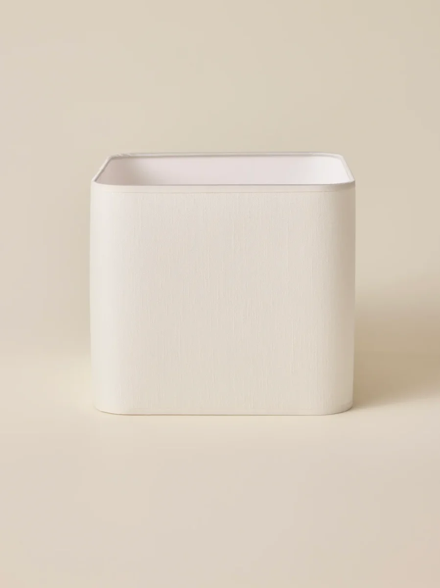 Abat-jour forme carrée aux angles légèrement arrondis, coloris ivoire. Allure raffinée, matière effet soie sauvage et aspect légèrement satiné.