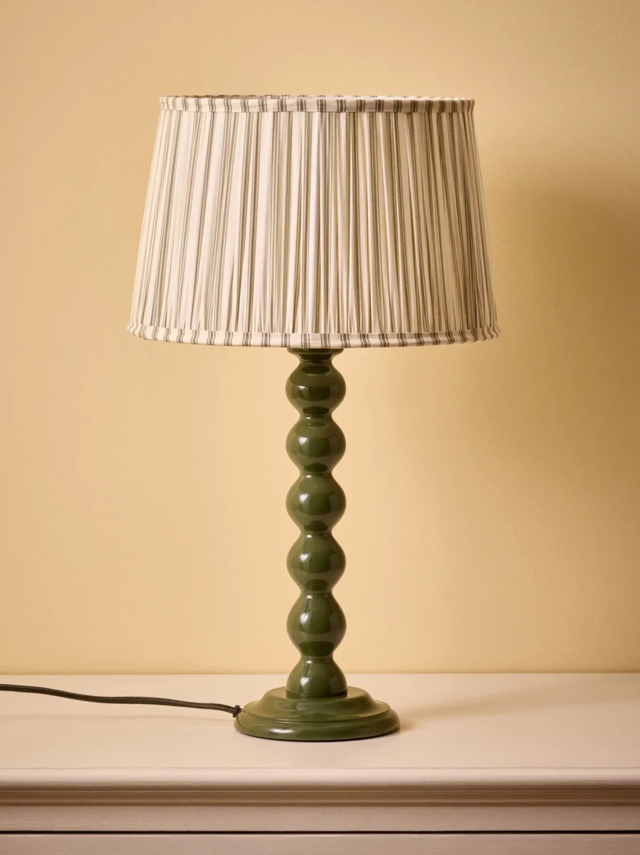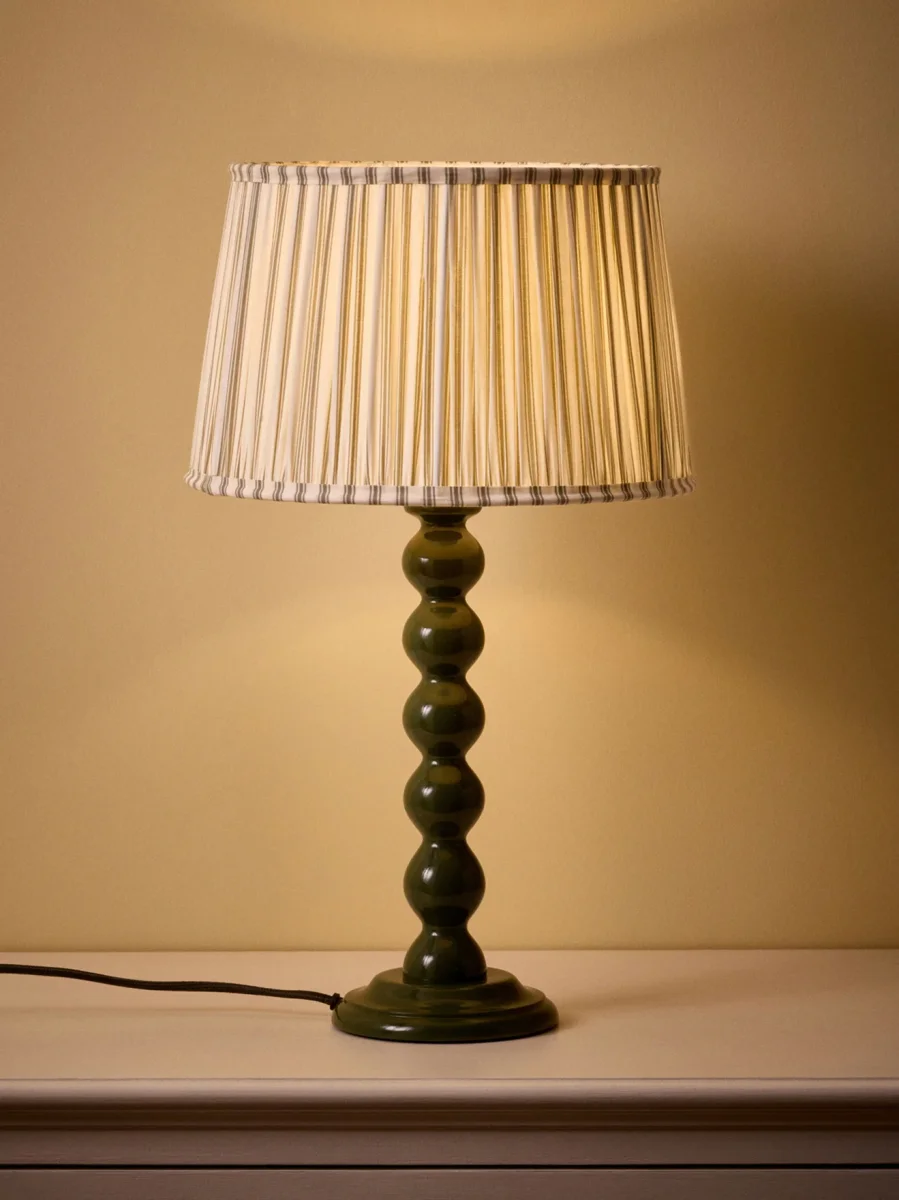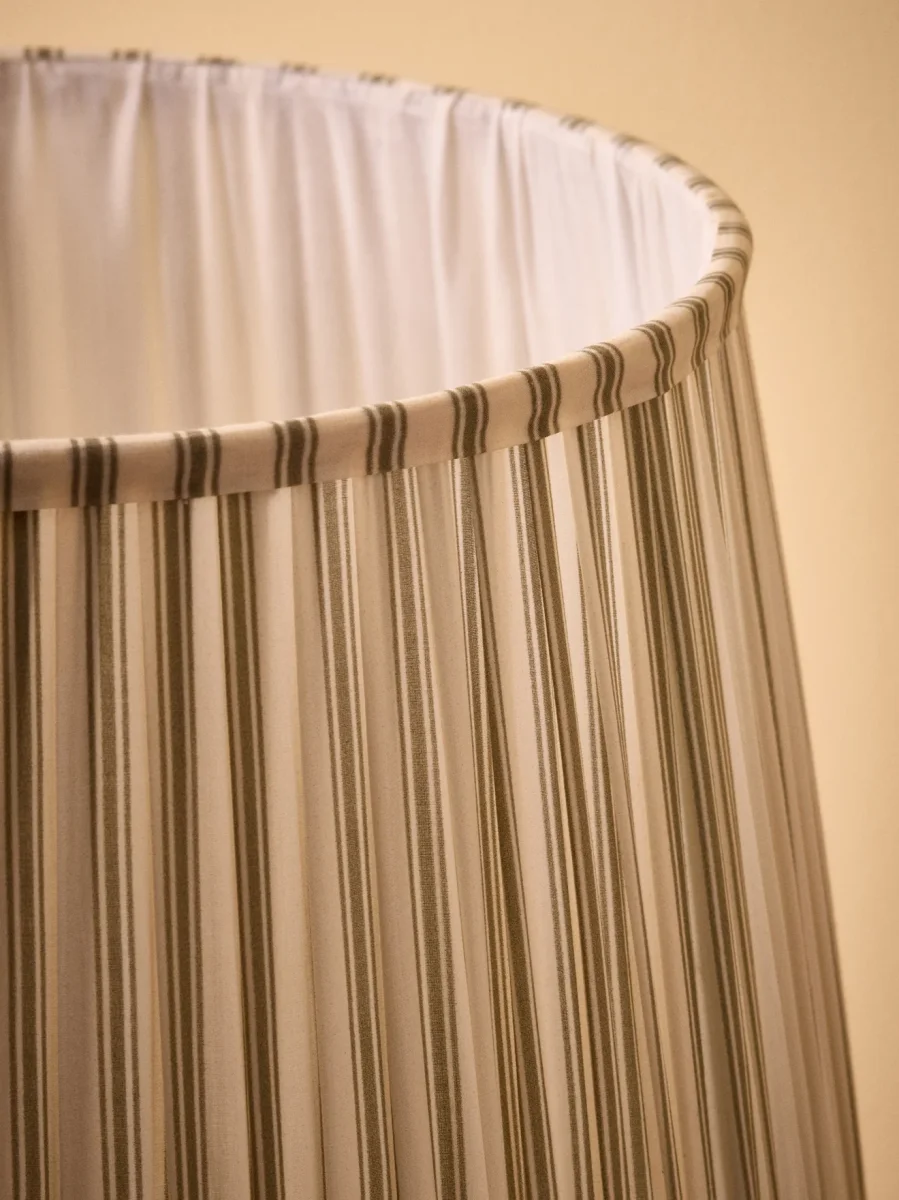 Modèle évasé style empire en coton plissé. Habillé d’une fine rayure verte, cet abat-jour est un modèle exclusif dont le plissé, réalisé à la main par nos partenaires en Inde, témoigne d’un savoir-faire et d’un travail délicat. Une pièce unique et élégante qui se coordonne à tous les intérieurs.