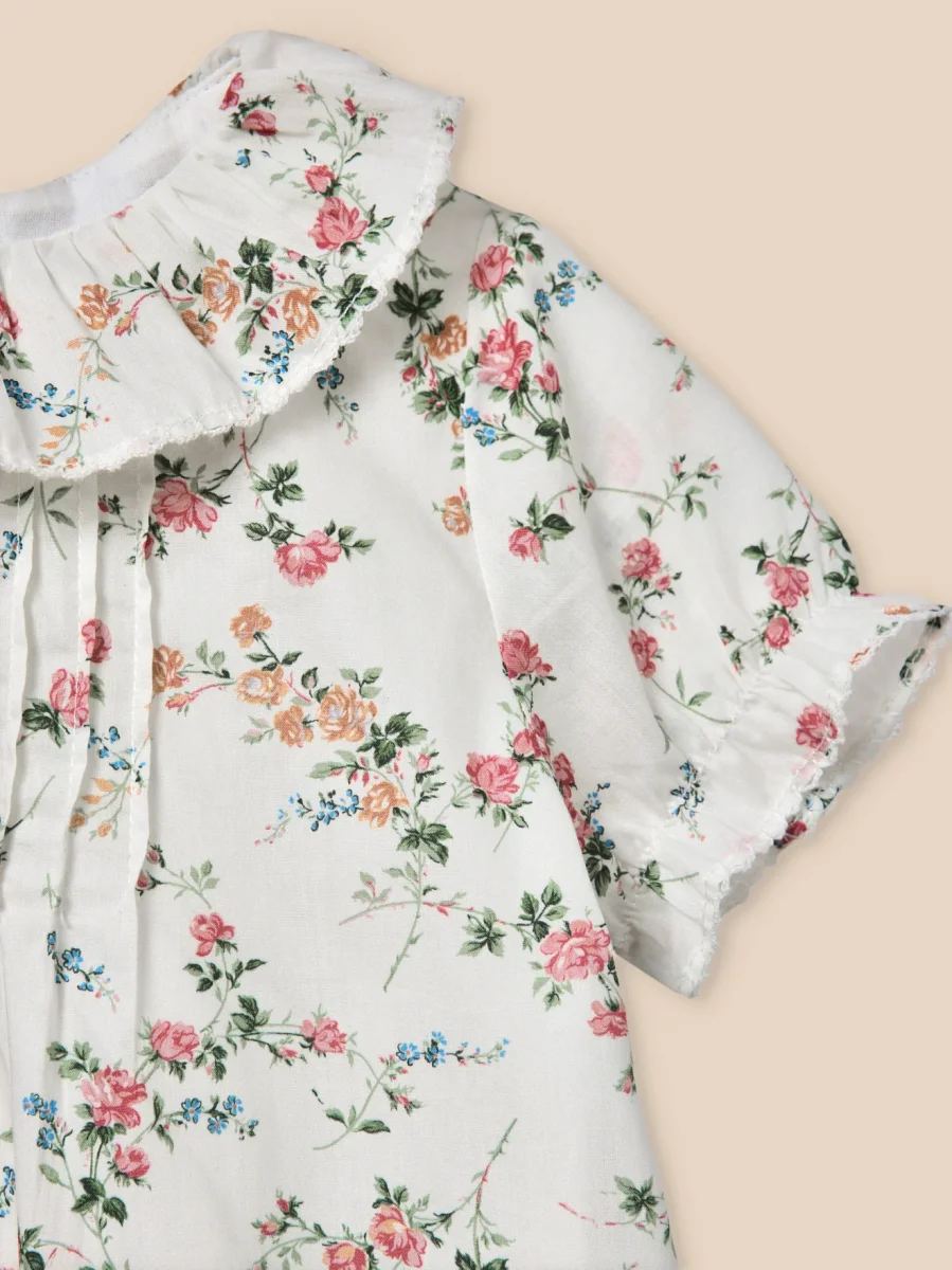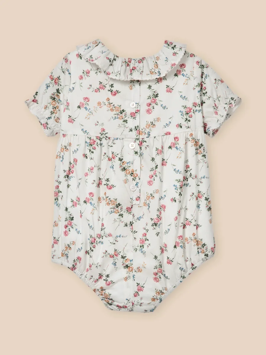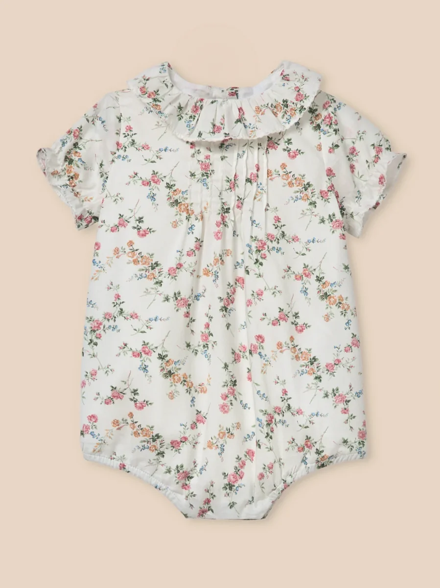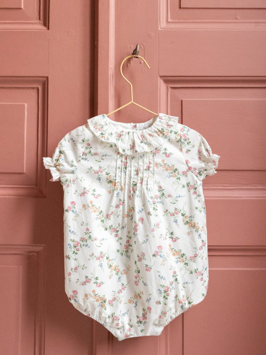 Une barboteuse en tissu Liberty Elisabeth, au charme rétro et à la coupe délicatement travaillée.
