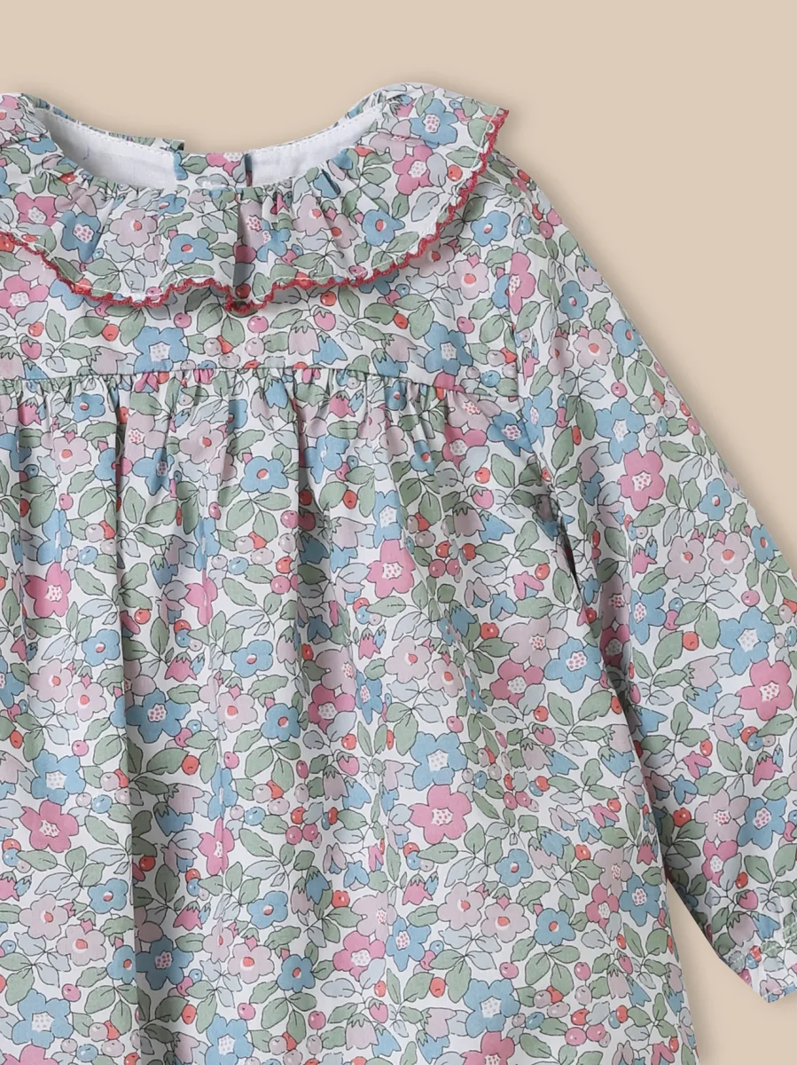 - Col volanté bordé d’un picot. Fronces sous la découpe pour une forme boule