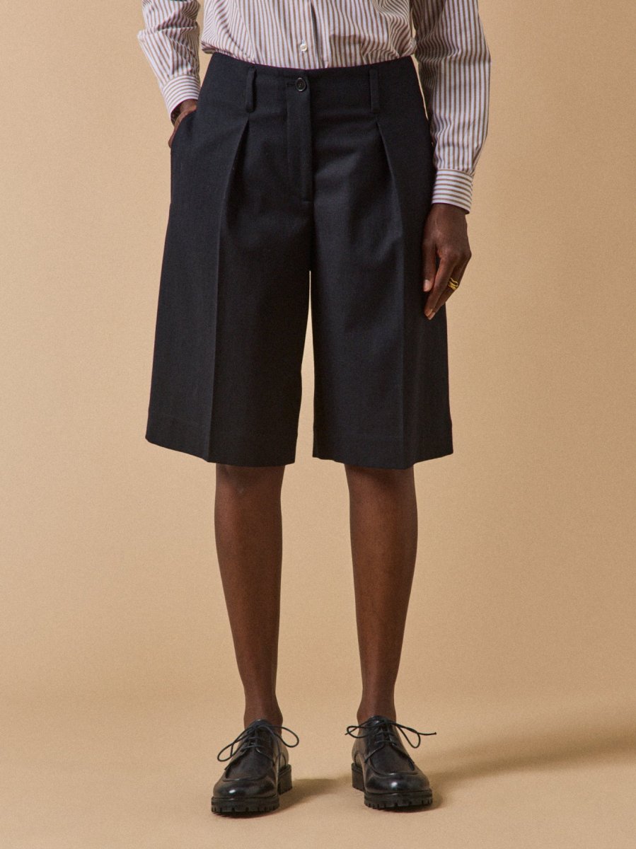 Sur un superbe lainage flanelle de la maison italienne Manteco, le bermuda se met en mode hiver et affiche un style irréprochable, tout en sobriété. Une pièce moderne et hors du temps, facile à porter au quotidien. Confection Europe.