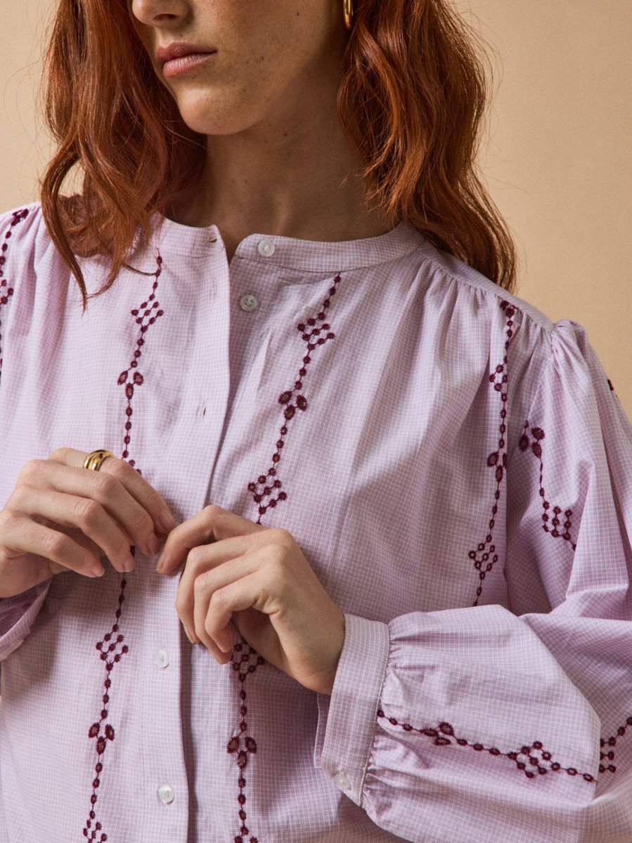 Mélange d’inspiration vintage, de pièce raffinée et d’esprit bohème, la blouse cultive les beaux détails brodés… Sur un tissu micro carreaux tissé-teint et dans des tonalités profondes.