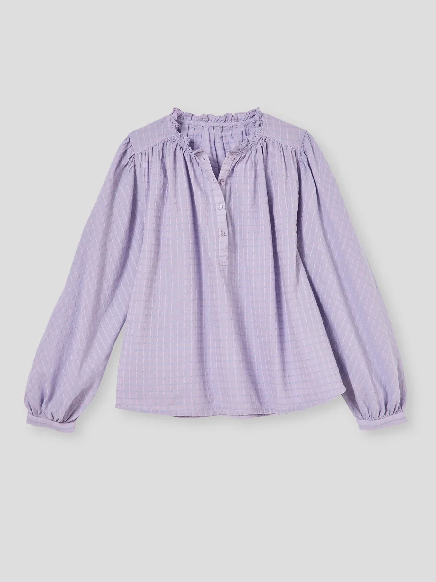 - Finition volantée au col rond, petite patte boutonnée ; manches longues montées sur fronces, bracelets boutonnés