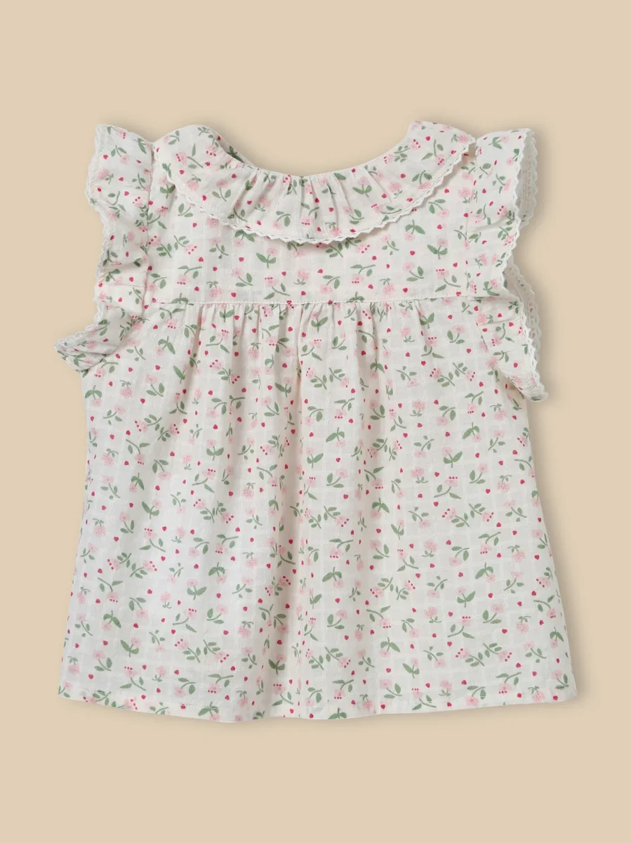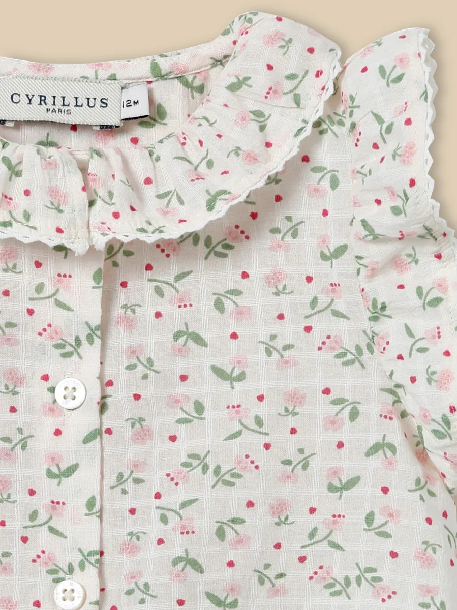Légère et aérienne, une blouse en gaze de coton aux jolis volants d’été. Col et manches volantés bordés d’un picot coloré Ouverture par boutons
