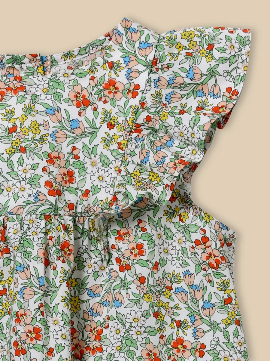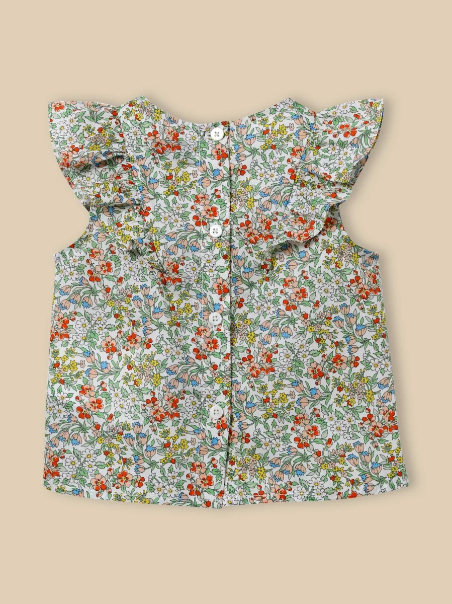 Blouse raffinée en tissu Liberty fleuri, ornée de manches volantées.