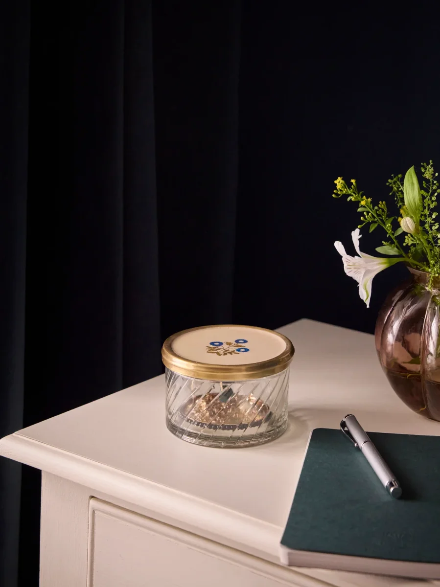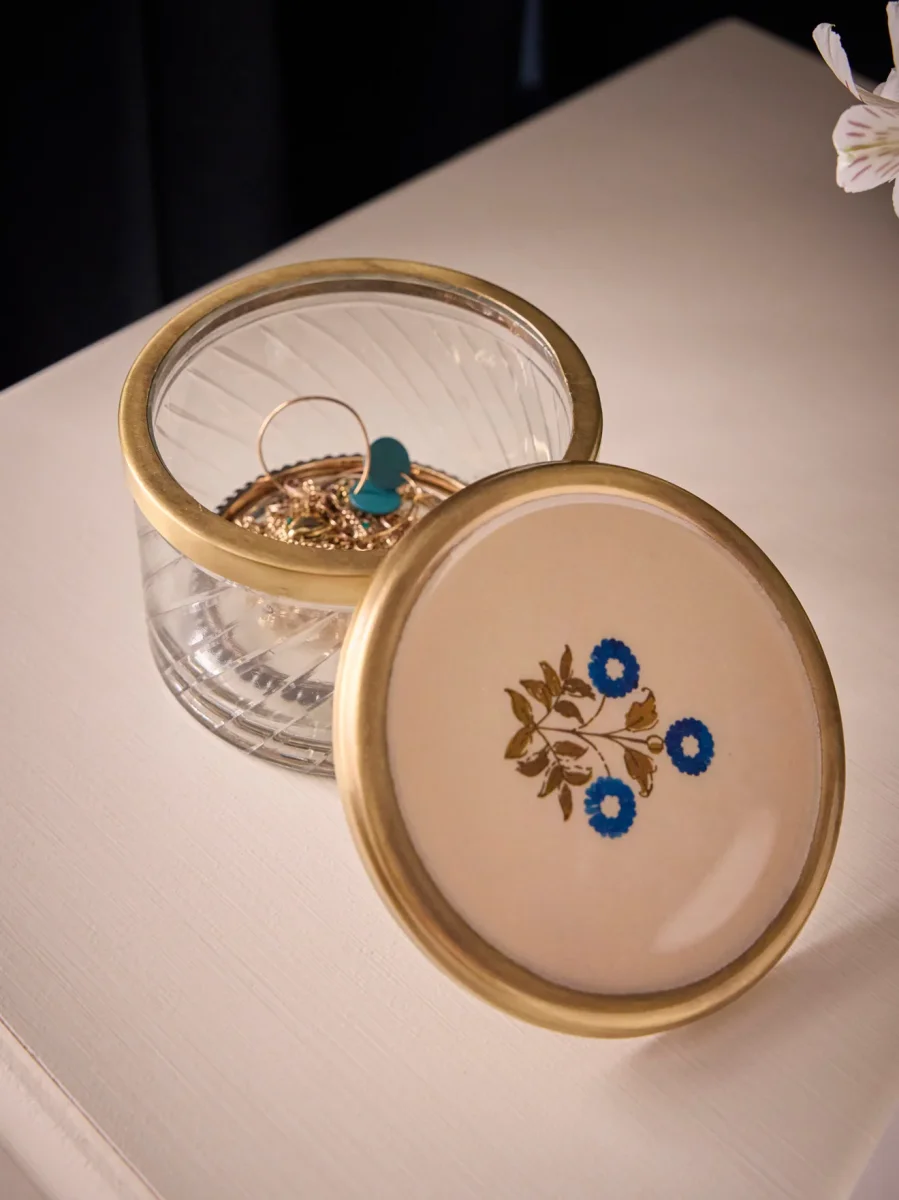 Petite boîte en verre strié accompagnée de son couvercle marquée de notre motif floral Ashley. Vide-poche ou petit rangement aux finitions raffinées.