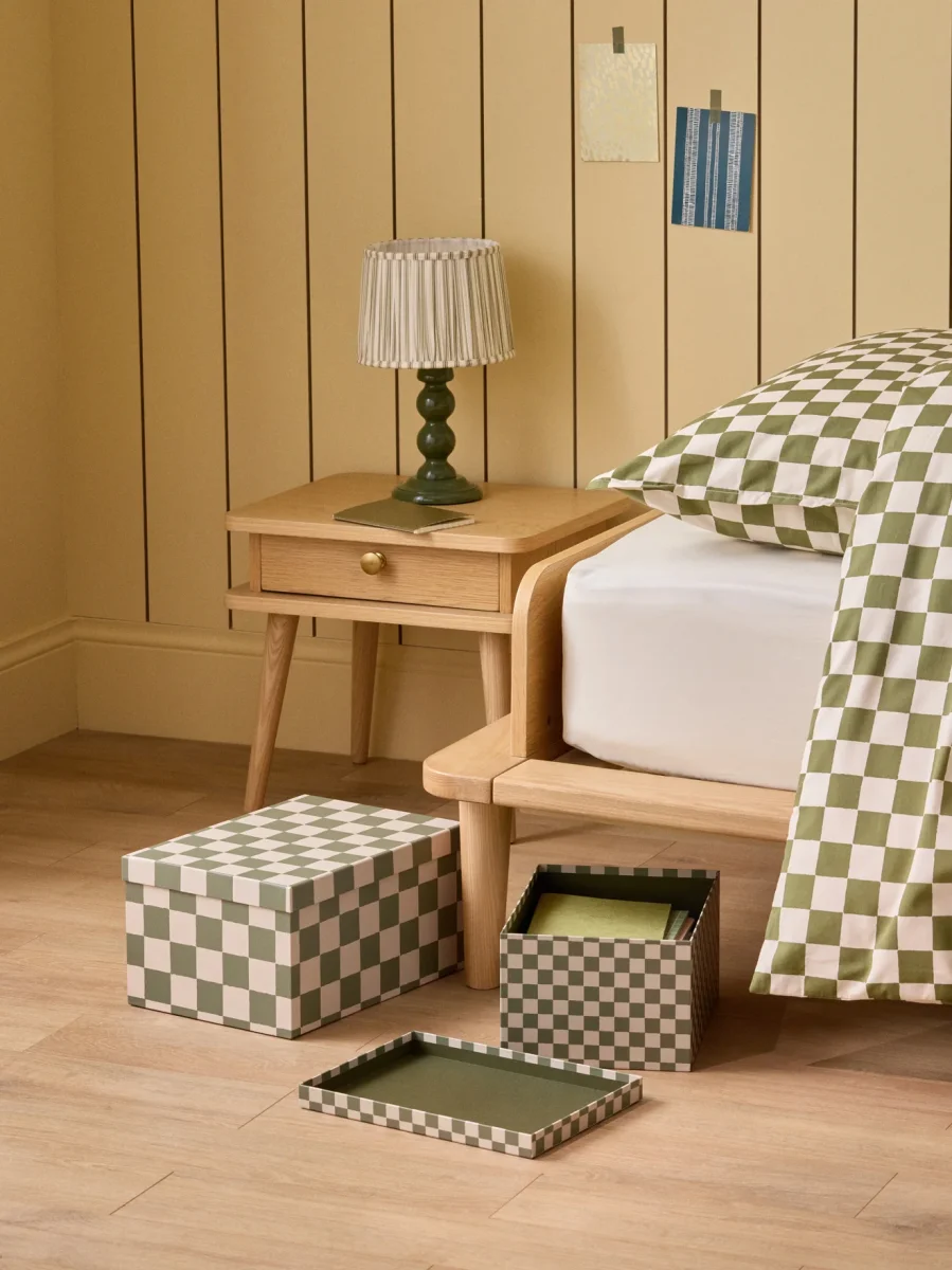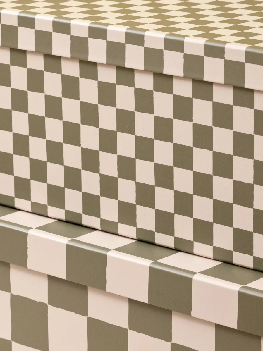 Lot de 2 boîtes de rangement, avec couvercle, en papier texturé imprimé damier. Ce motif graphique est à retrouver dans notre collection Maison.