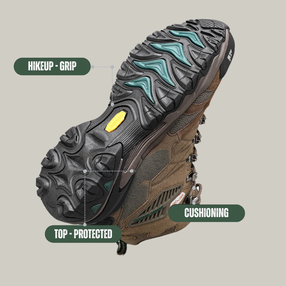 ‣ Semelle crantée haute adhérence : excellente traction sur sol humide, rocailleux ou boueux.