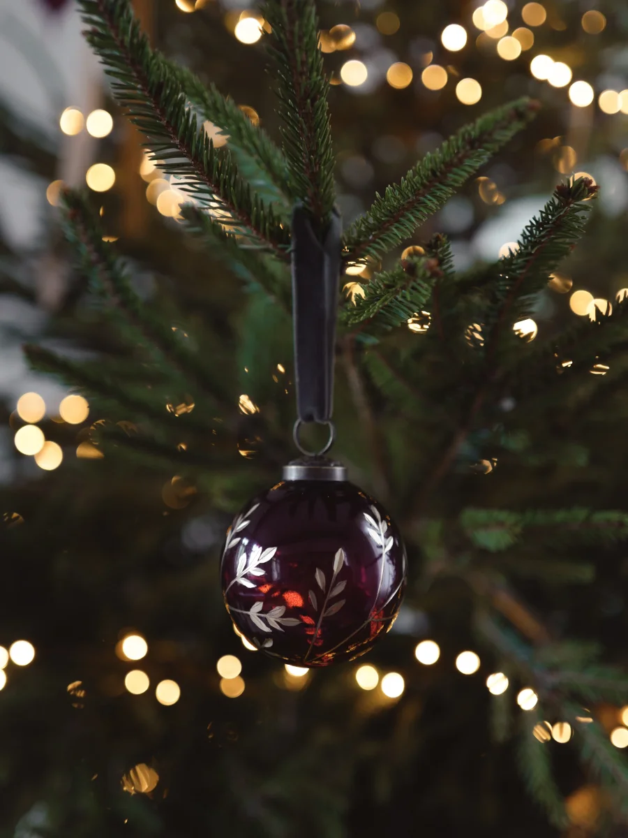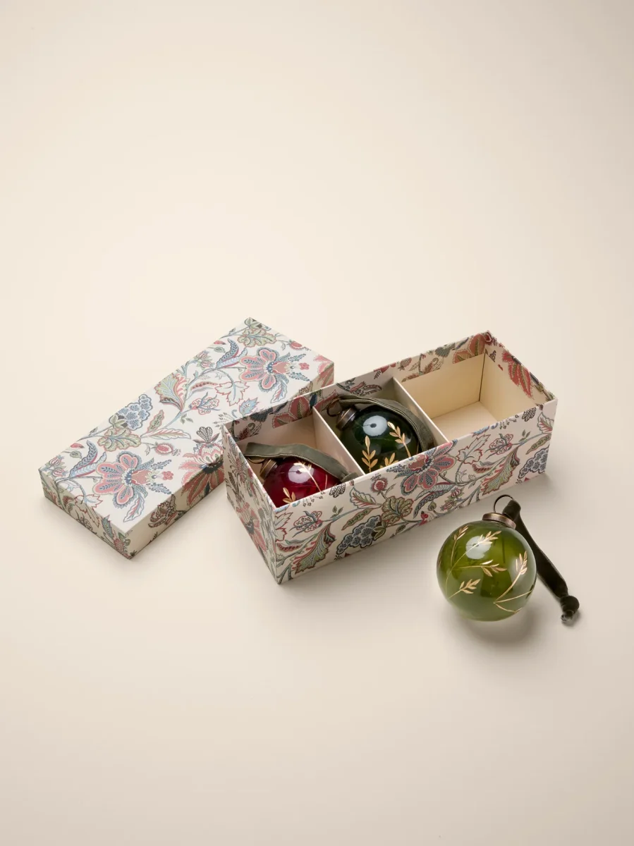 Boules en verre avec motifs feuillage coloris doré peints à la main. Lot de 3 boules de 3 couleurs différentes : vert sapin, rouge foncé et vert lichen. Ruban en velours vert. Fabriquées et peintes à la main en Inde. Livrées dans une jolie boîte en papier recouvert de notre imprimé exclusif de Noël.