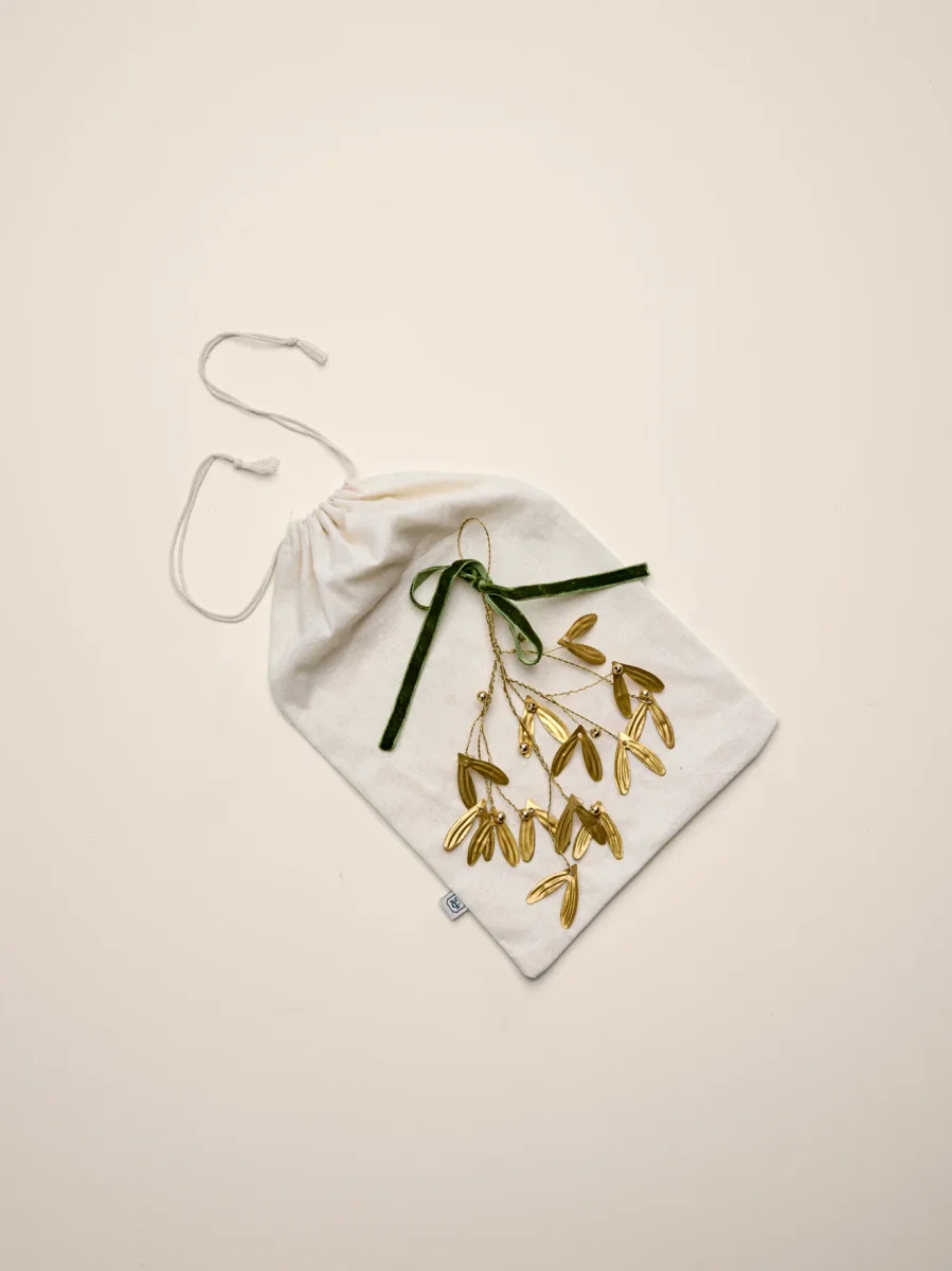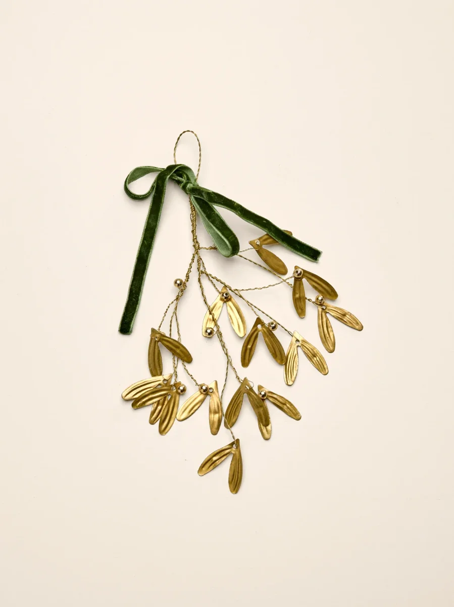 Noël sous le signe du charme et de la tradition. Bouquet de gui en métal coloris doré à suspendre grâce au ruban en velours vert. Livré dans un pochon en coton.