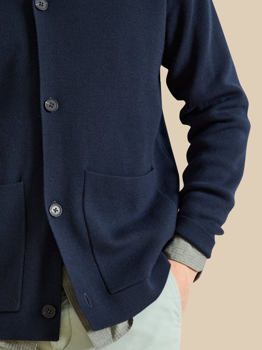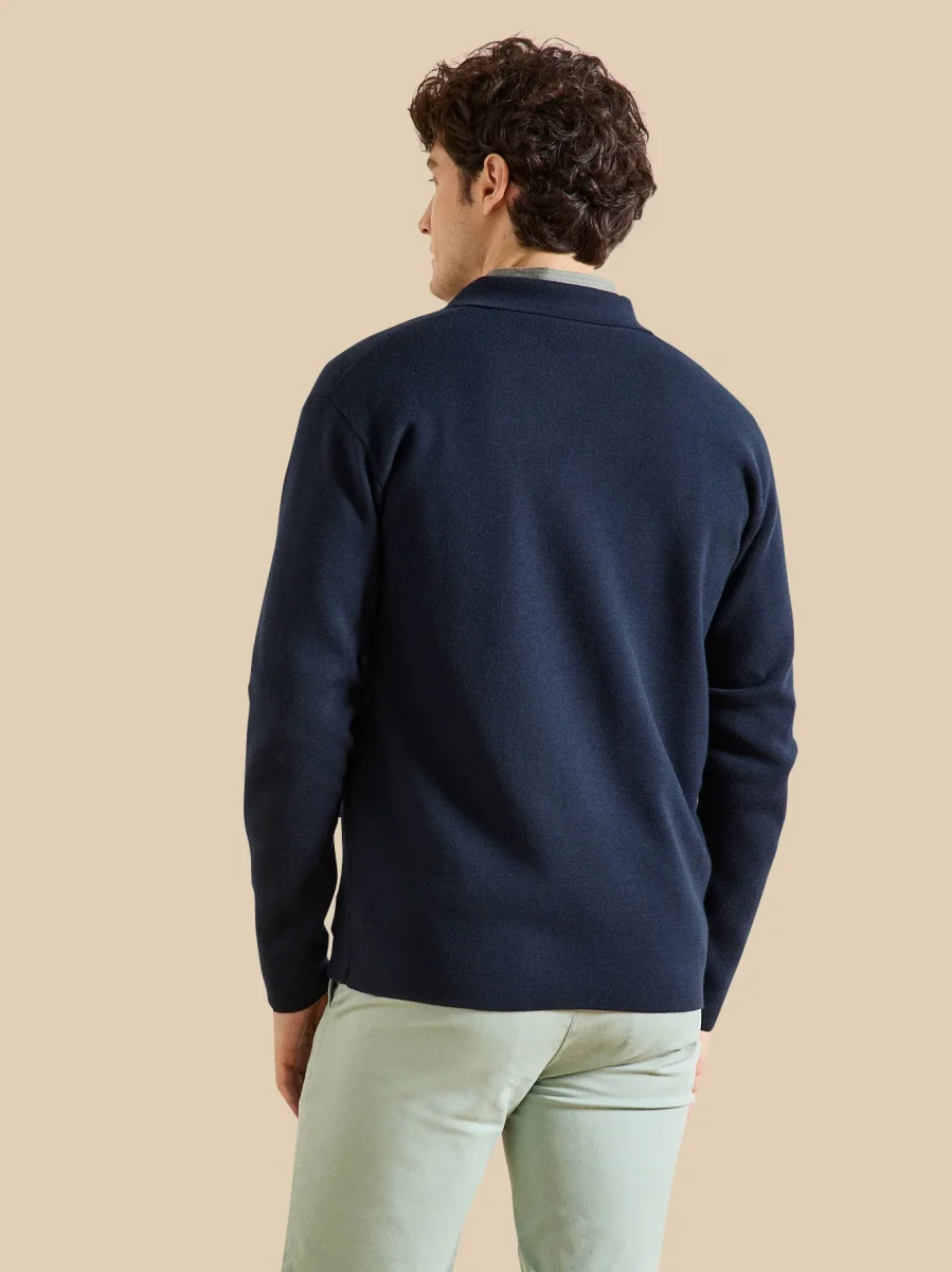 Un volume pratique chic, entre veste et cardigan, pour cette pièce qui choisit la sobriété. En maille milano qualité lourde avec laine et fibres recyclées.