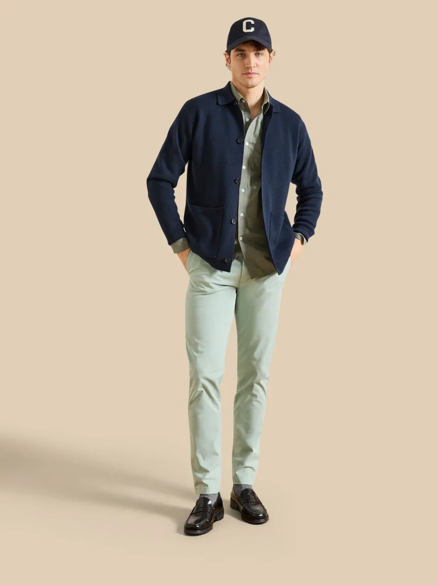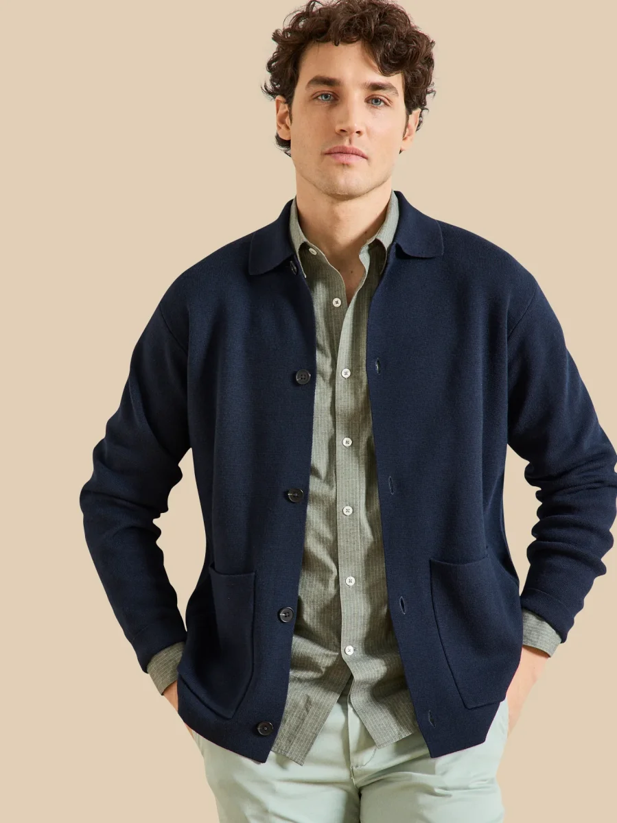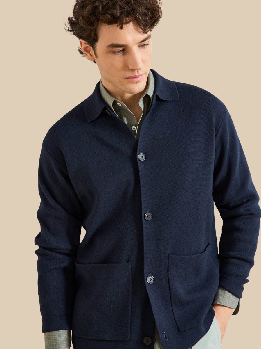 Un volume pratique chic, entre veste et cardigan, pour cette pièce qui choisit la sobriété. En maille milano qualité lourde avec laine et fibres recyclées. Col polo, boutonnage et 2 grandes poches plaquées devant Longueur dos 70 cm, longueur des manches 61 cm (en taille L)