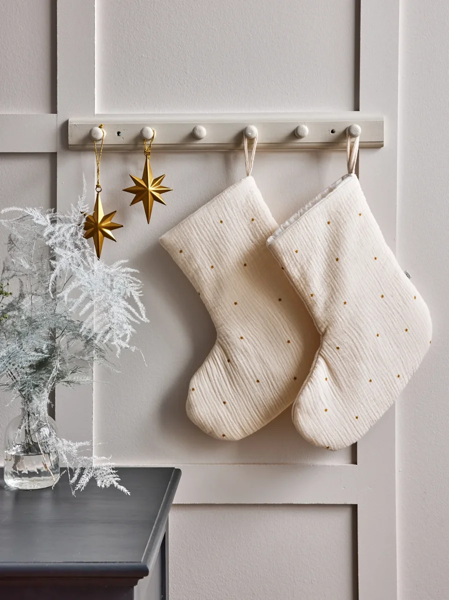 2 chaussettes à suspendre au sapin ou à la cheminée. En gaze de coton imprimée de petites étoiles coloris caramel. Pour une déco de Noël traditionnelle et raffinée.
