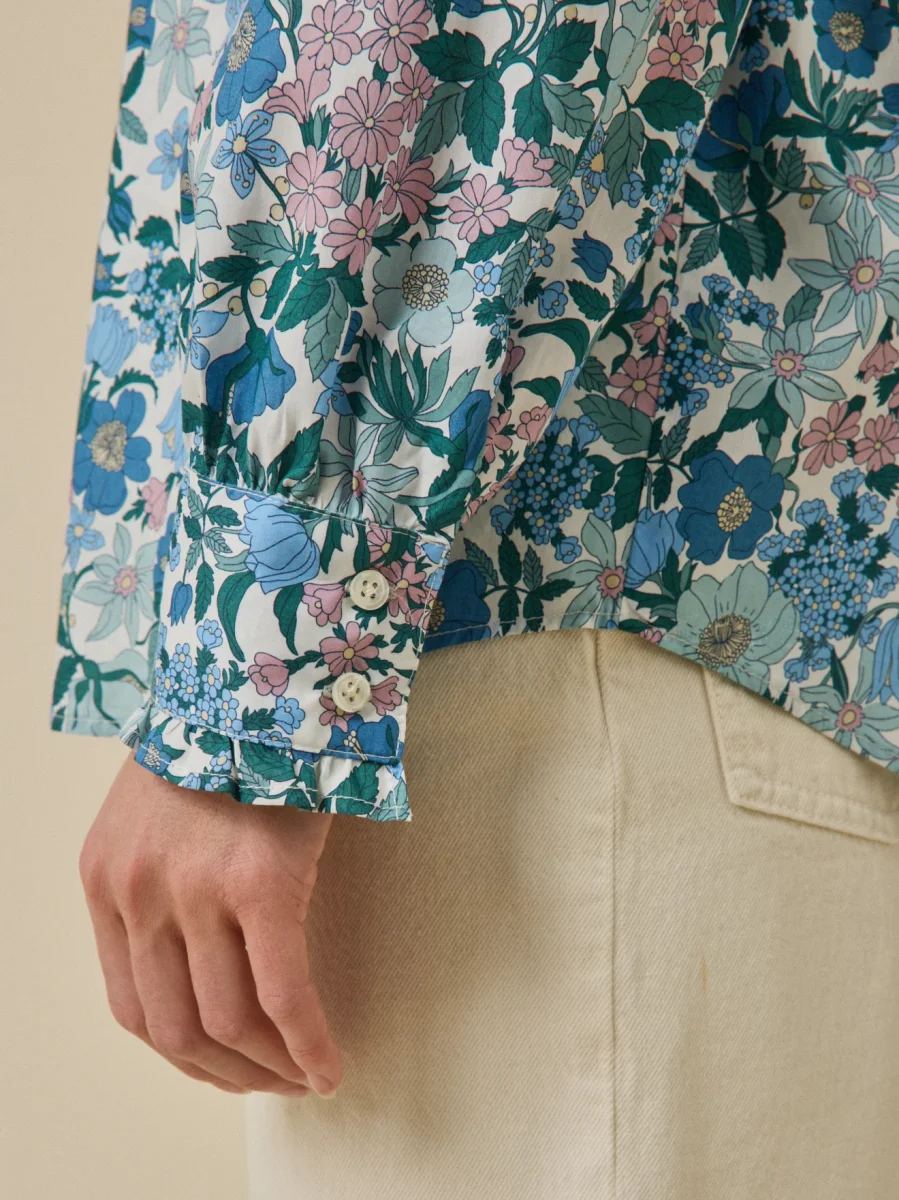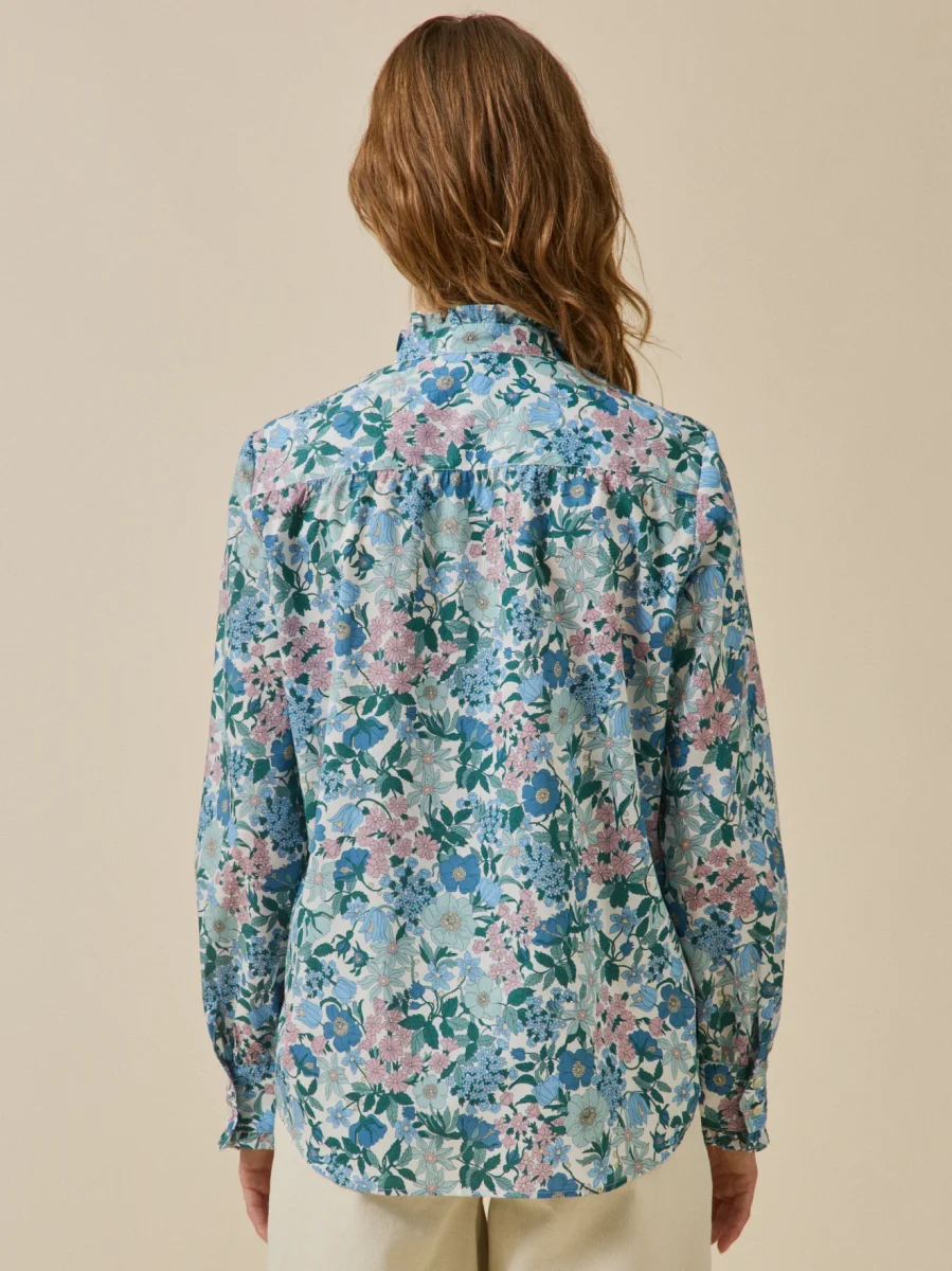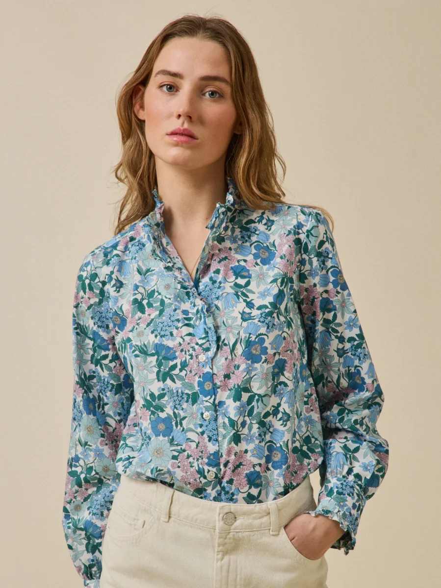- Finition volantée au col rond, patte de boutonnage ; fronces sous découpes épaules et dos