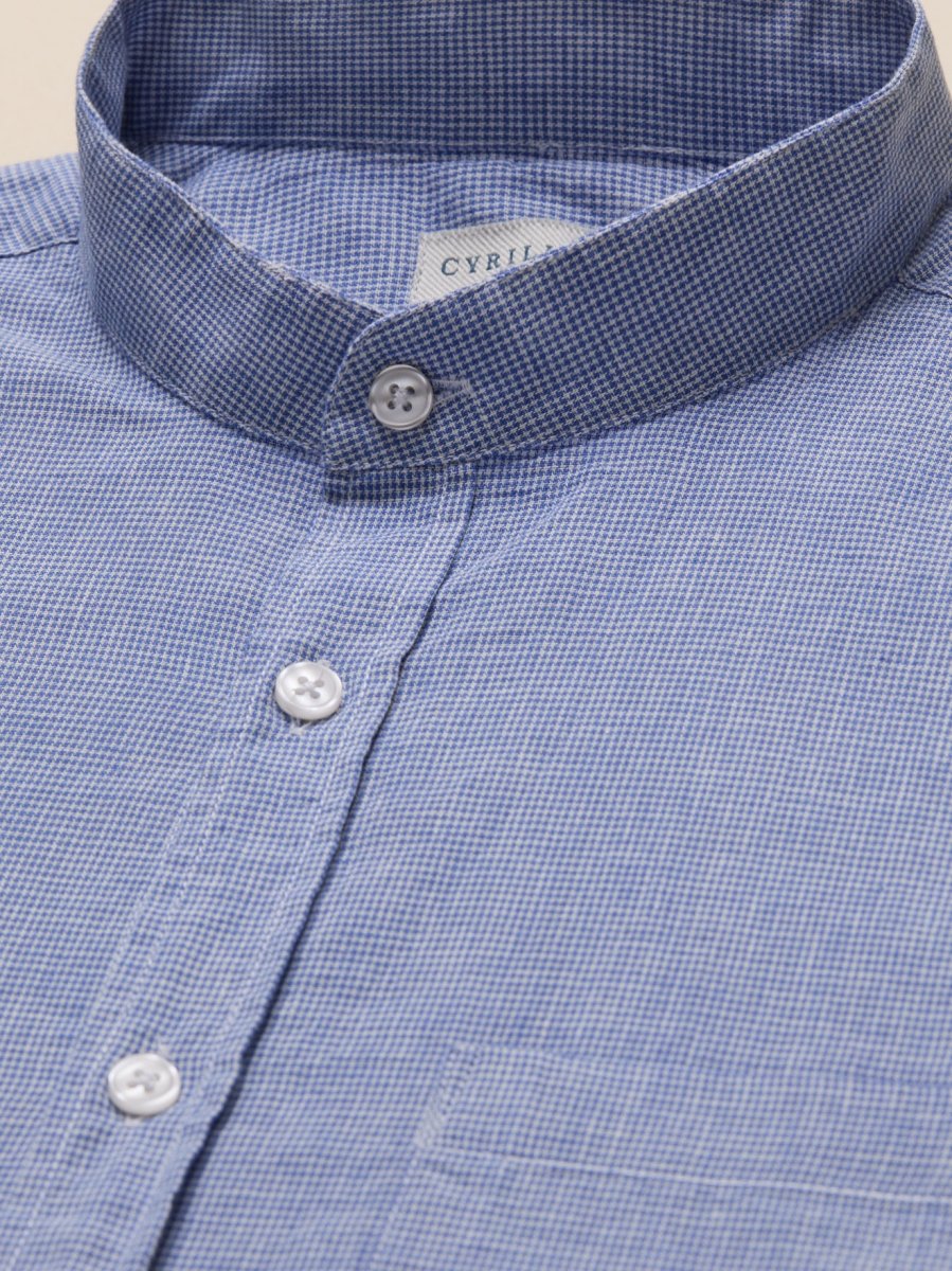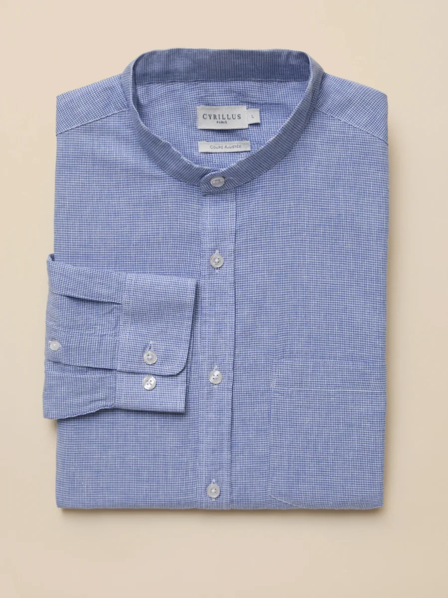 Une matière légère en coton et lin pour une chemise aux micro-motifs carreaux confectionnée au Maroc, agréable à porter quand il fait chaud. Coupe ajustée soulignant la silhouette, légèrement cintrée poitrine et taille. Col mao, patte de boutonnage, poche poitrine, poignets arrondis avec boutonnage ajustable 2 positions Découpe épaules, découpe et 2 pinces de cintrage […]