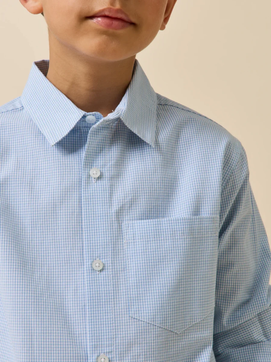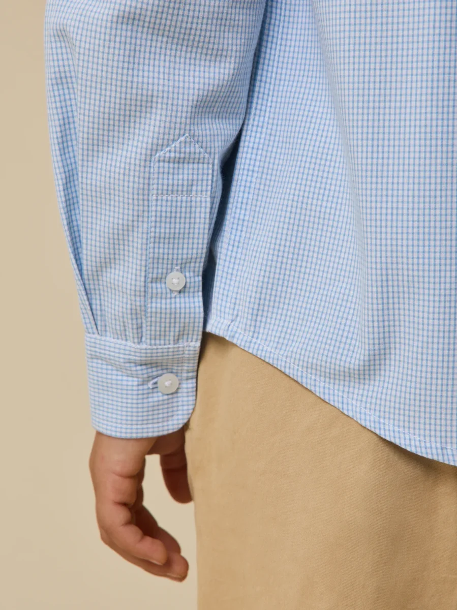 Chemise en micro vichy, ce classique élégant est facile à associer au vestiaire des garçons. Col pointes libres. Poche poitrine. Empiècement dos Ouverture boutonnée. Base arrondie Manches longues. Poignets boutonnés