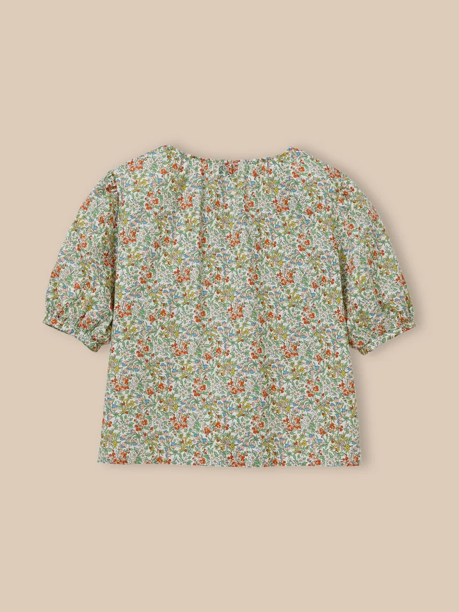 Chemise en tissu Liberty Nazanin au motif floral délicat, manches ballon et petites fronces à l’encolure, offrant une coupe tendance.