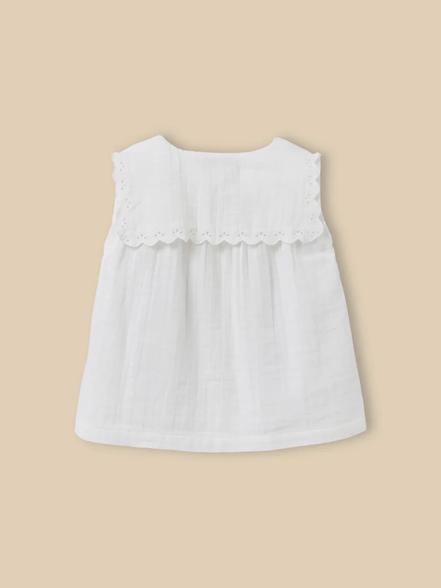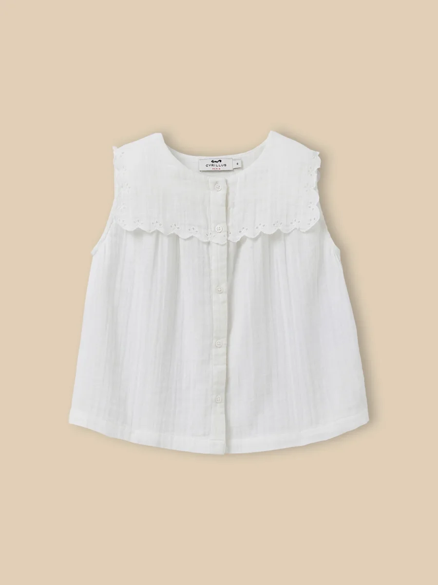 Chemise sans manches esprit vareuse en gaze de coton biologique. Grand col marin festonné avec détails de broderie anglaise. Pièce estivale qui allie légèreté, confort et raffinement.