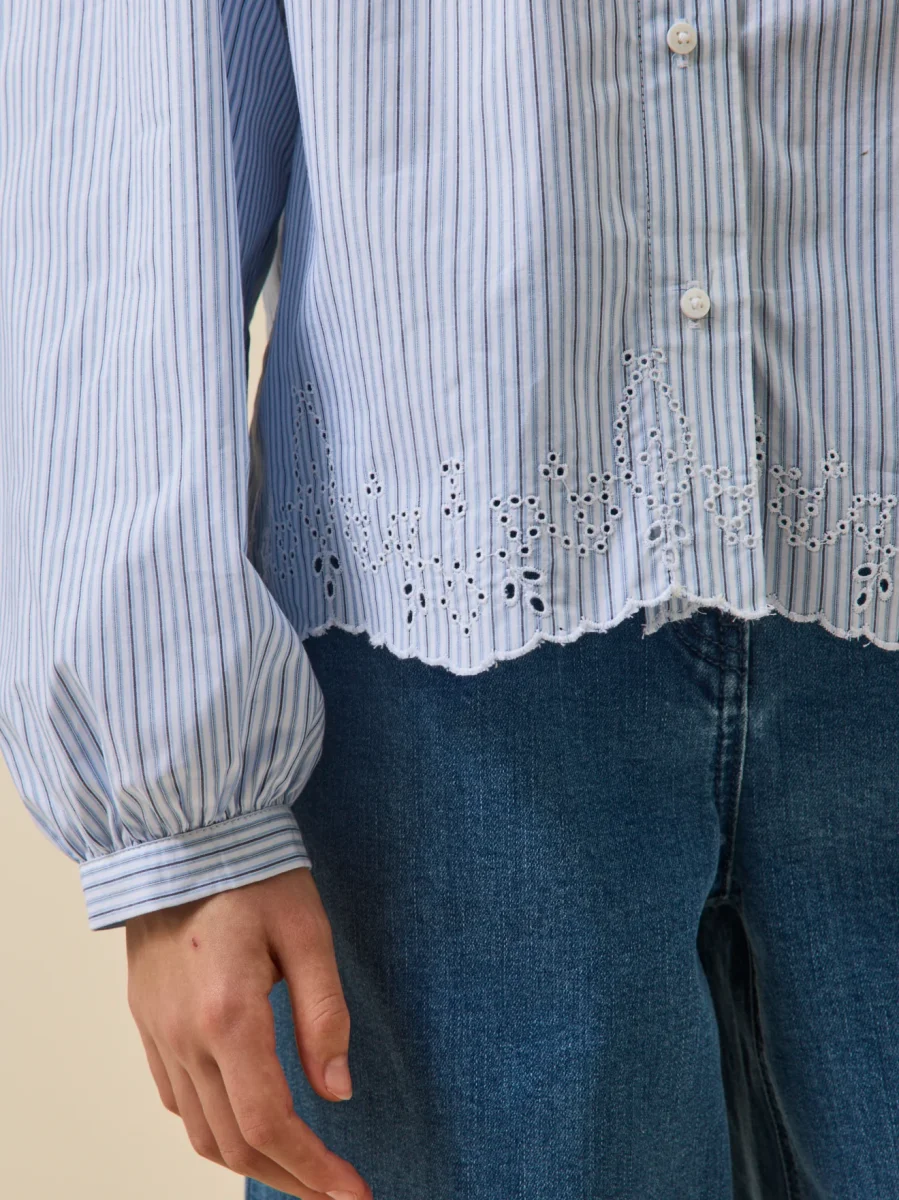 Une chemise au style décontracté-chic Col officier. Fronces sous la découpe épaule devant et dos Ouverture boutonnée. Manches ballon, poignets boutonnés Base asymétrique en broderie anglaise