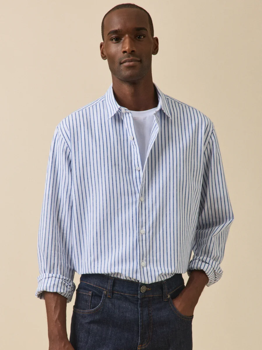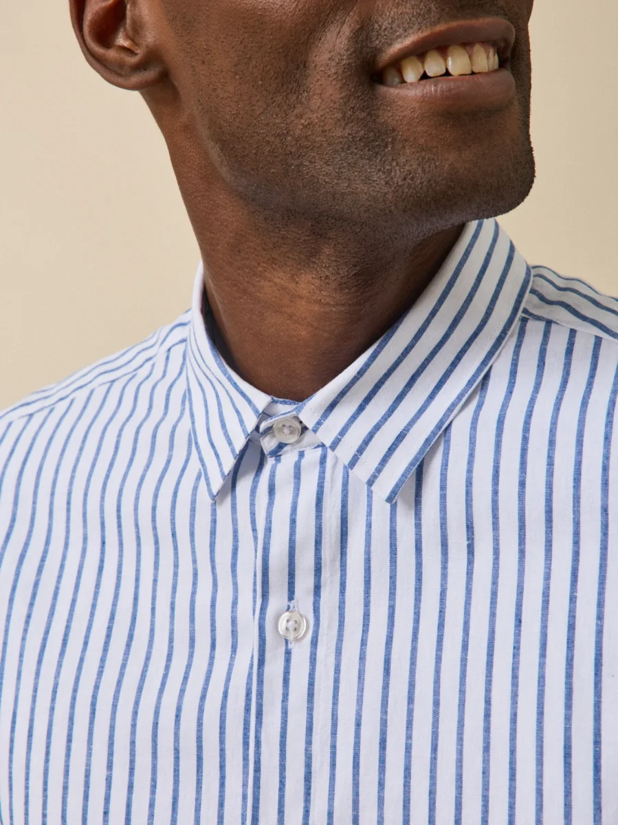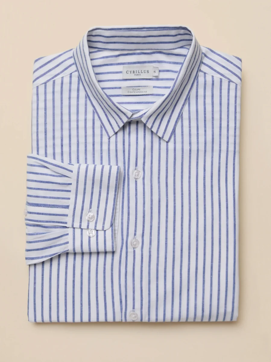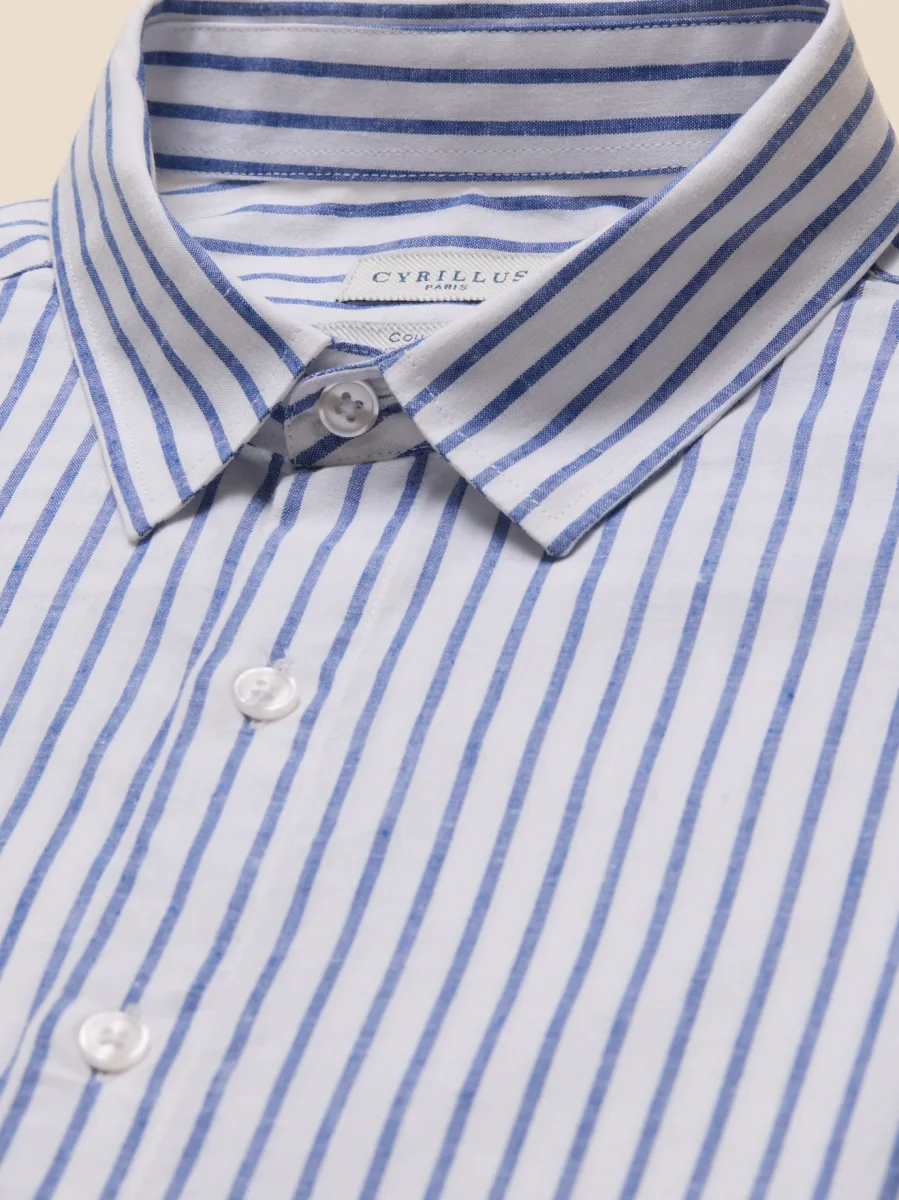 Rayures cool chic sur beau tissu coton et lin de la maison espagnole Sidogras. Confectionnée au Maroc, la chemise est aussi à l’aise en mode urbain avec un pantalon de ville qu’en mode décontracté avec un jean. Coupe contemporaine convenant à toutes les morphologies.
