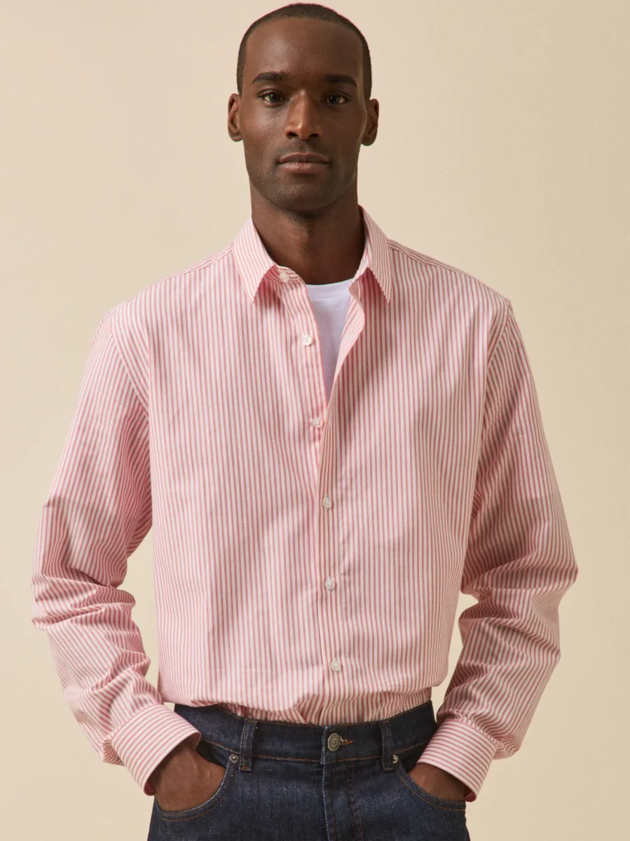 La chemise rayée fait partie des essentiels du vestiaire masculin. Confectionnée au Maroc dans une belle matière en coton biologique certifié et tissée au Portugal, celle-ci s’offre un style facile entre casual et urbain. Coupe contemporaine convenant à toutes les morphologies.