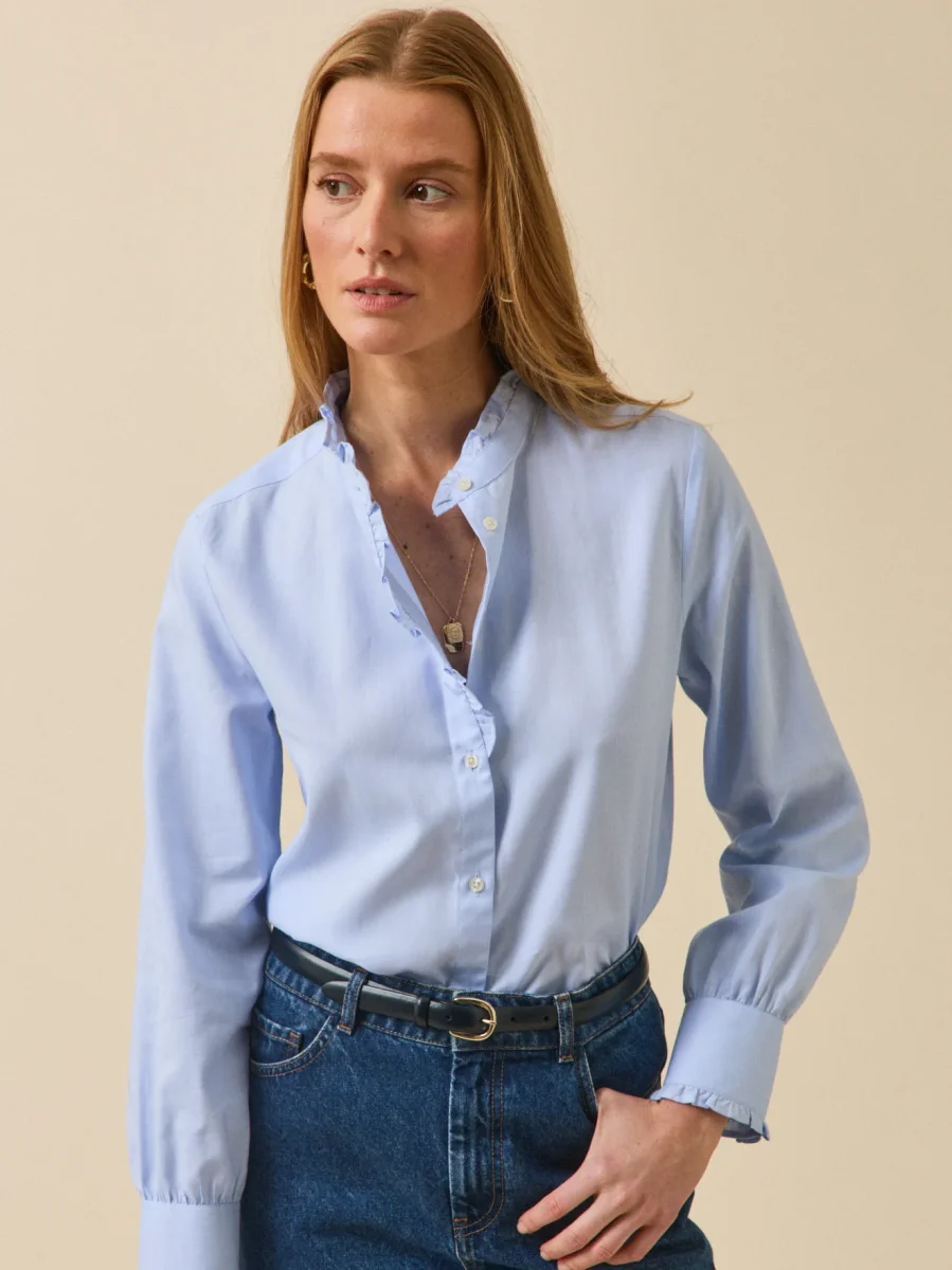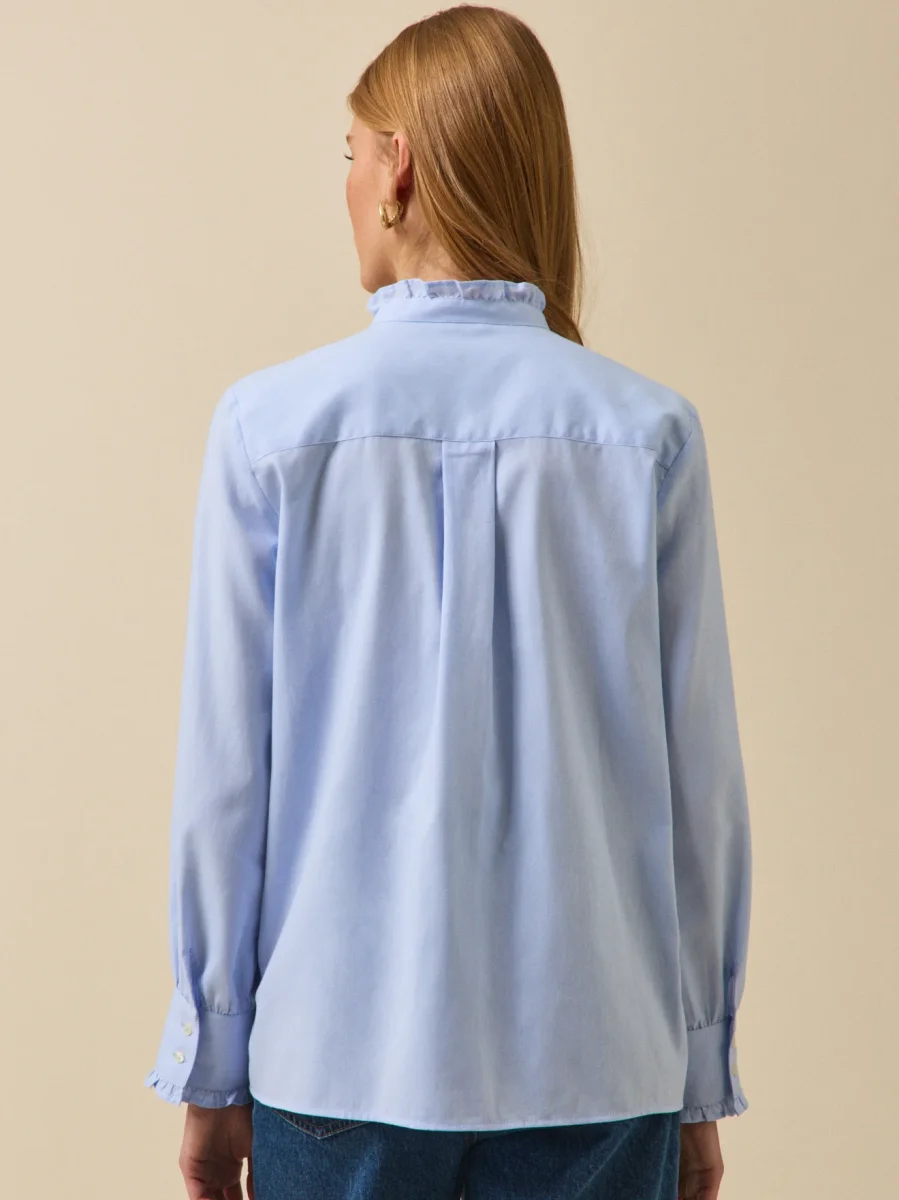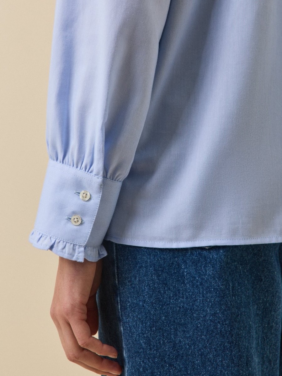 - Finition volantée au col rond, le long d’une partie de la patte de boutonnage et aux poignets boutonnés