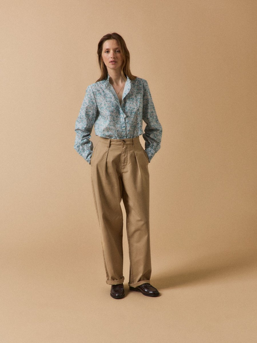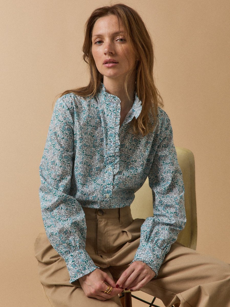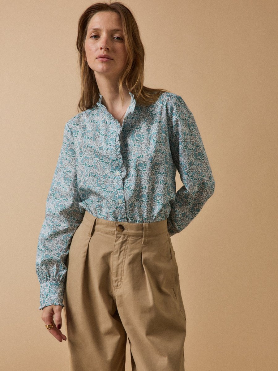 - Finition volantée au col rond et le long d’une partie de la patte de boutonnage ; fronces sous découpes épaules et dos
