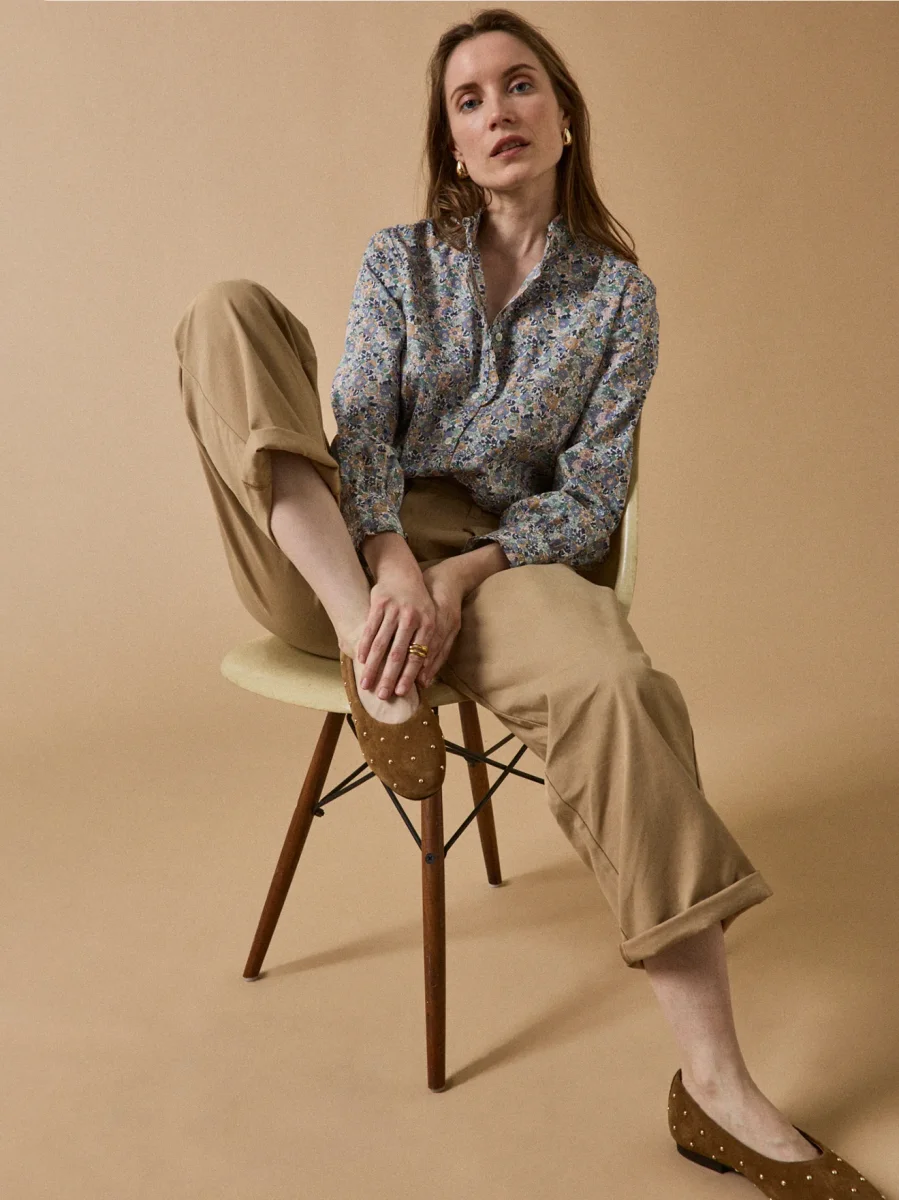 Pour cette collection à la demande, nous faisons appel à des techniques uniques plus performantes et raisonnées. Chaque vêtement est découpé pièce par pièce, ce qui permet d’éviter la surproduction et le gaspillage. Confection Europe. Finition volantée au col rond et le long d’une partie de la patte de boutonnage ; fronces sous découpes épaules […]