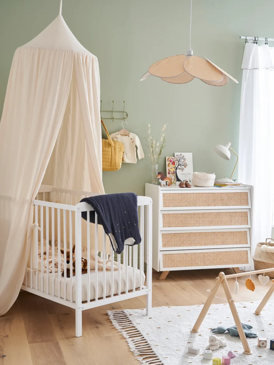 Ciel de lit en coton gaufré, doux et élégant. Il décore la chambre et crée un cocon cosy autour d’un lit ou d’un berceau. Il peut également former un coin détente, façon cabane, avec des coussins et un tapis douillet. Le ciel de lit s’accroche simplement au plafond avec un clou.