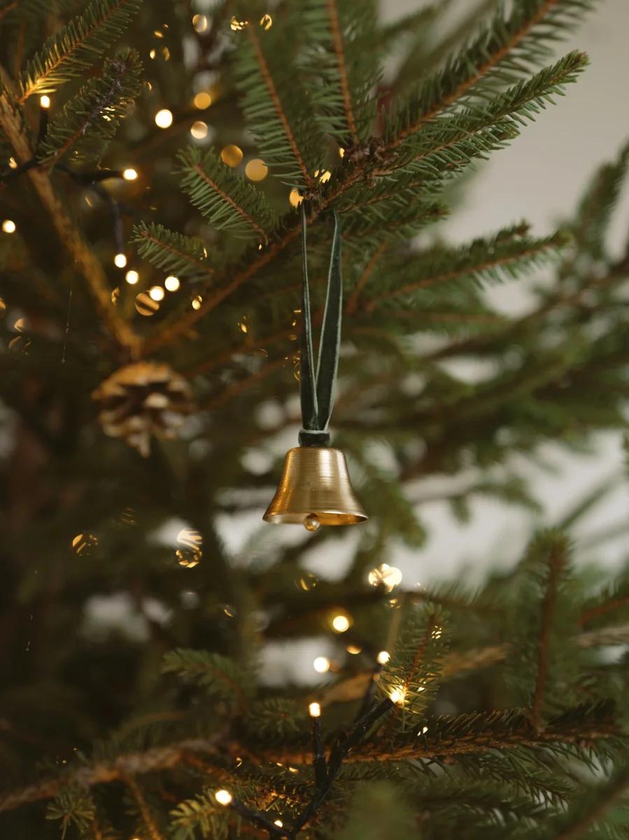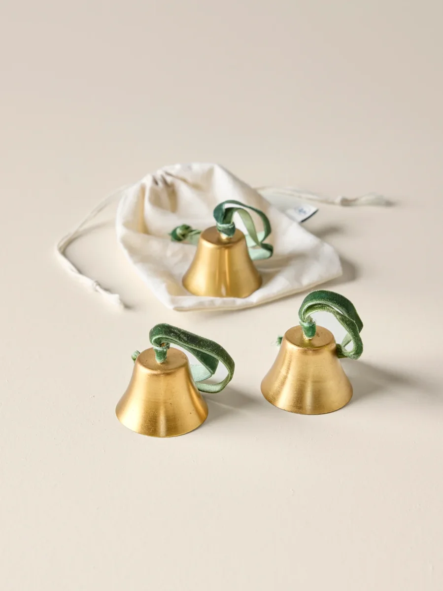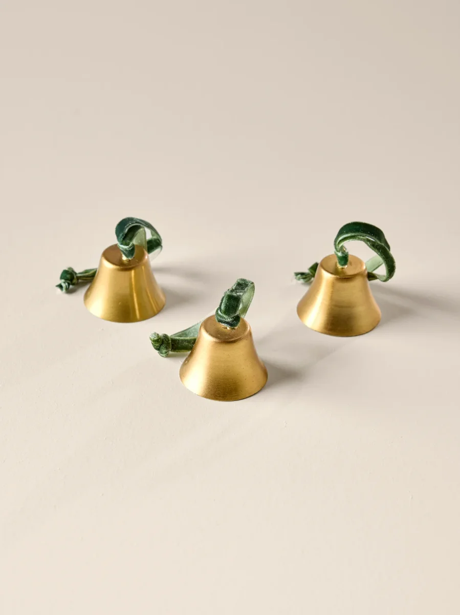 Lot de 3 petites cloches en métal maintenues par un ruban en velours vert. Éléments à suspendre au sapin pour une déco de Noël authentique et raffinée. Livrées dans un pochon en coton.