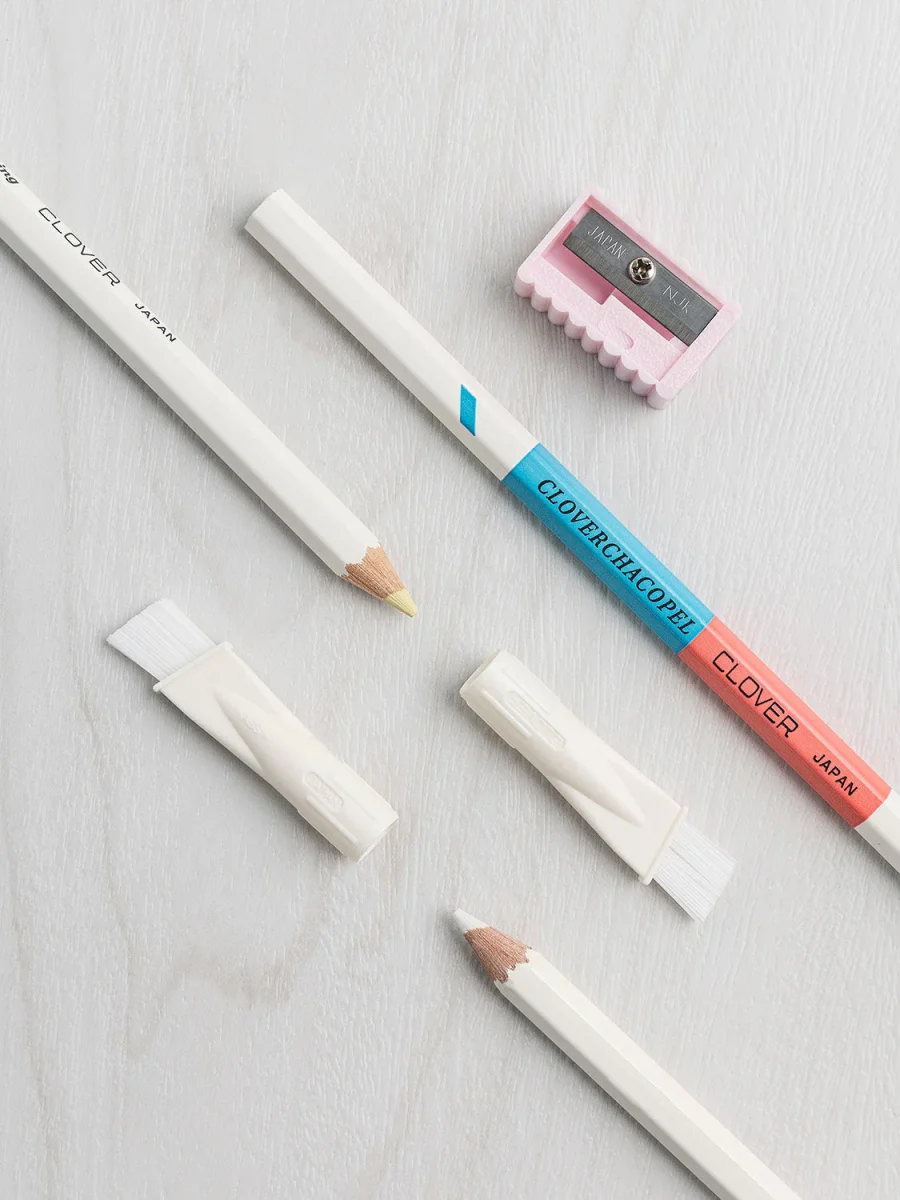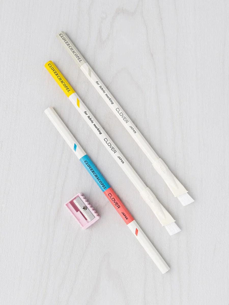 When you need a fine, exact line for marking precise details, choose these Clover Chacopel chalk pencils. This pencil kit includes a sharpener and three chalk pencils in white, yellow and half pink/half blue, in addition to two pencil caps with brush. We love using these for marking small details like construction circles, especially since they almost always brush or wash out easily. We always recommend testing on a scrap first, just in case!