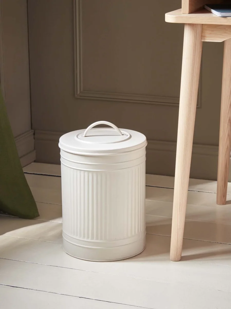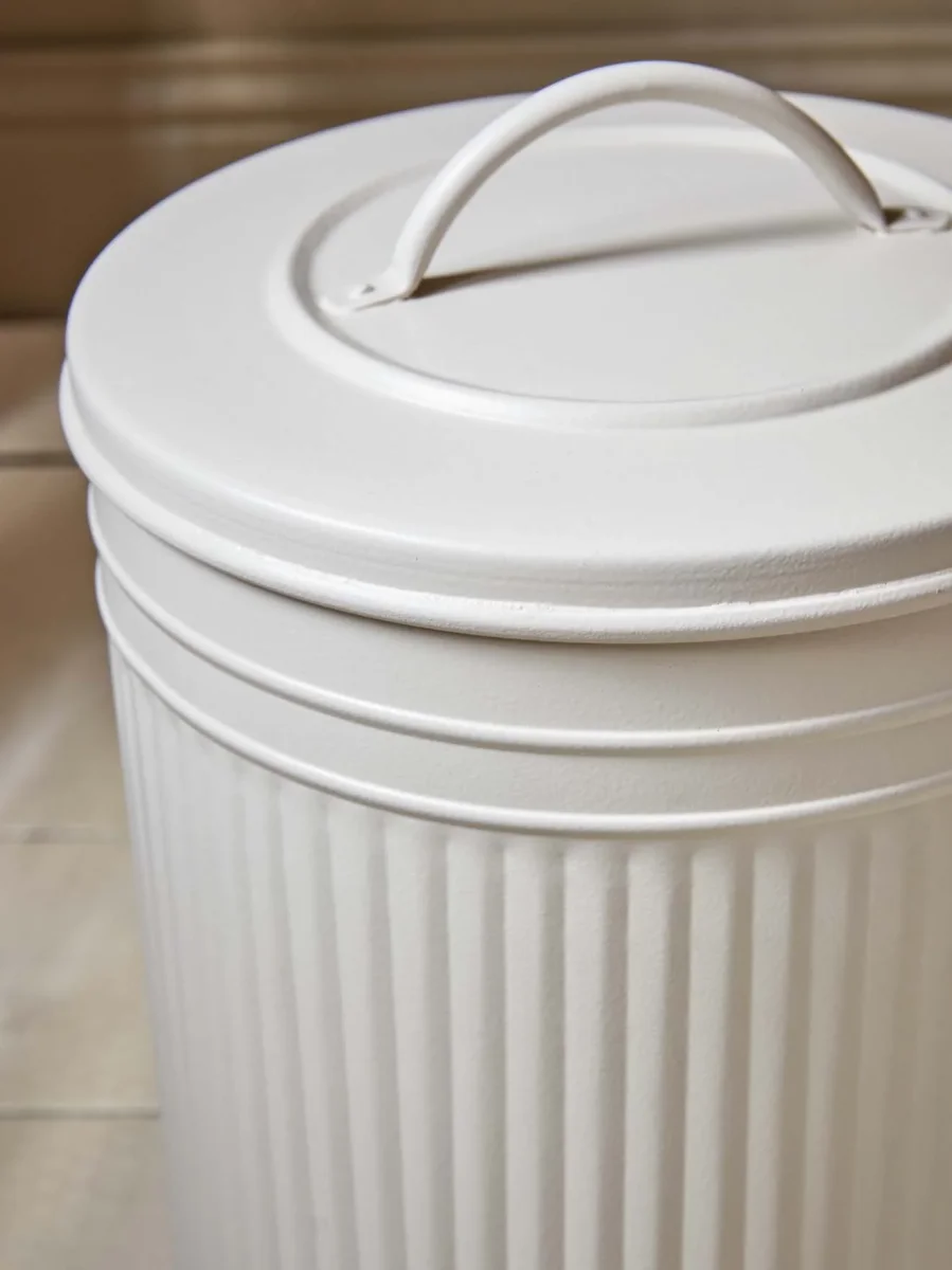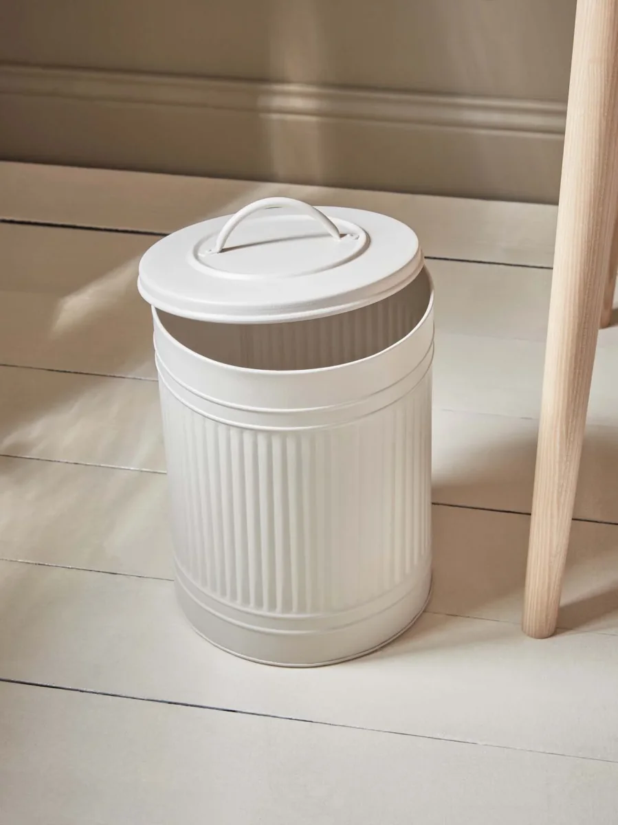 Poubelle en métal avec couvercle à poignée. Idéale au pied d’un bureau ou dans la salle de bain.