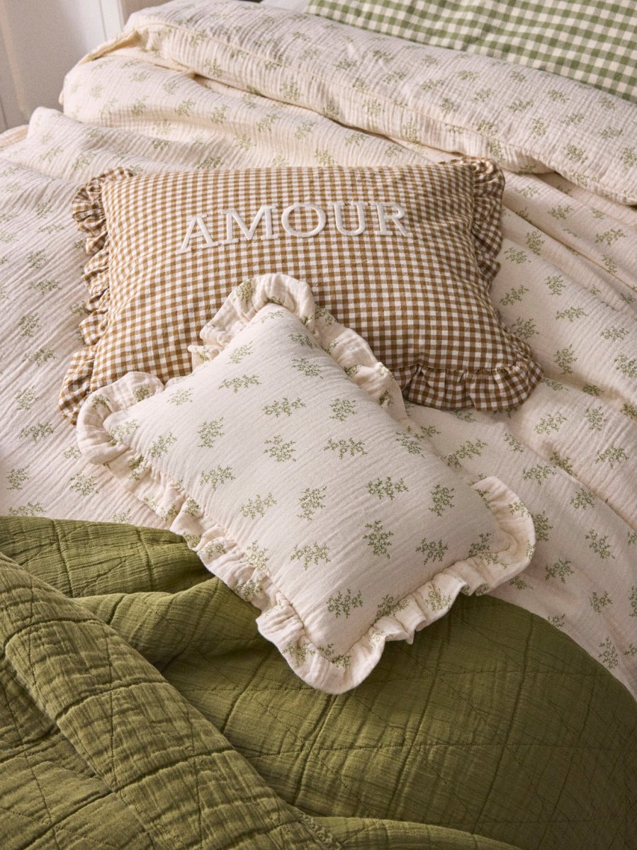 Fantaisie, charme et élégance. Petit coussin en gaze de coton bordé d’un large volant. Déhoussable au dos par boutons.