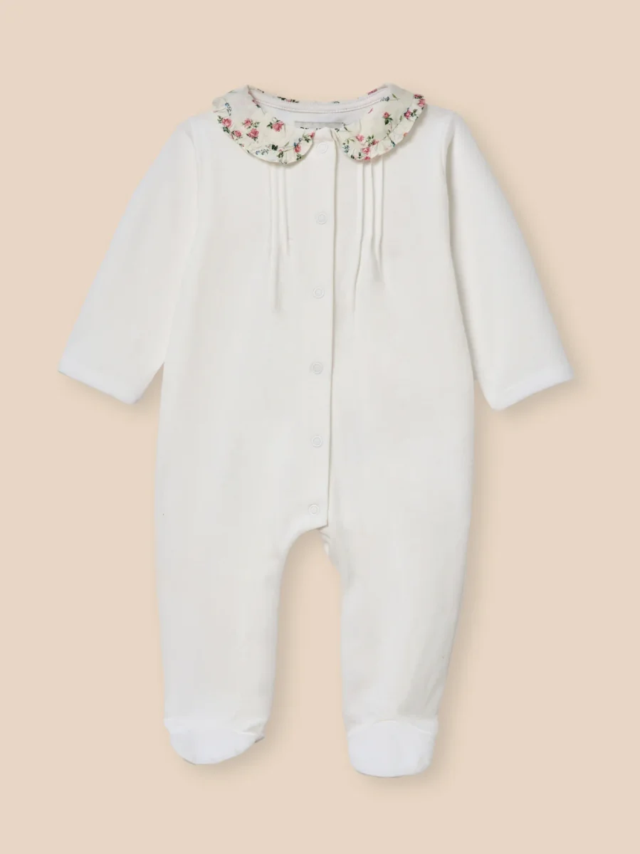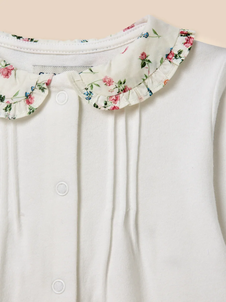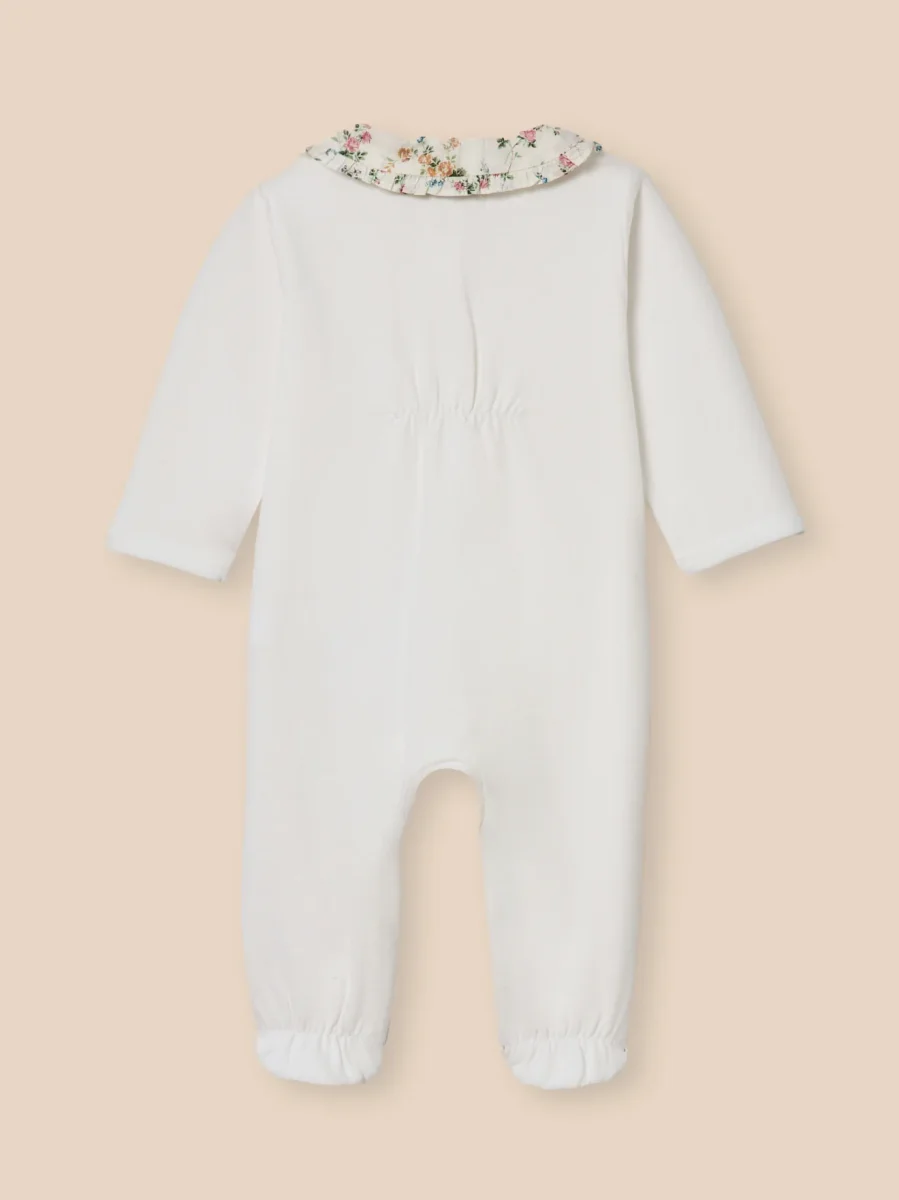 Pyjama bébé en jersey tout doux coton biologique, idéal pour respecter la peau sensible de bébé. Son col en tissu Liberty apporte une touche élégante et délicate : un cadeau de naissance plein de douceur.