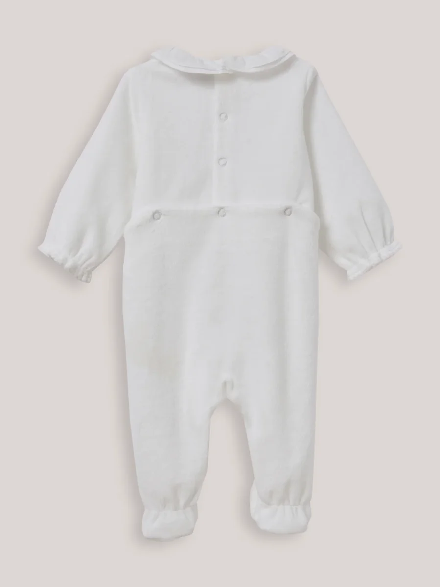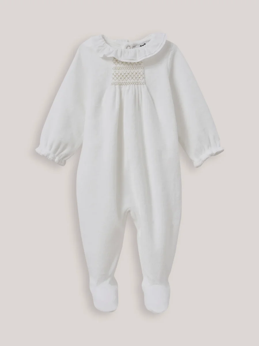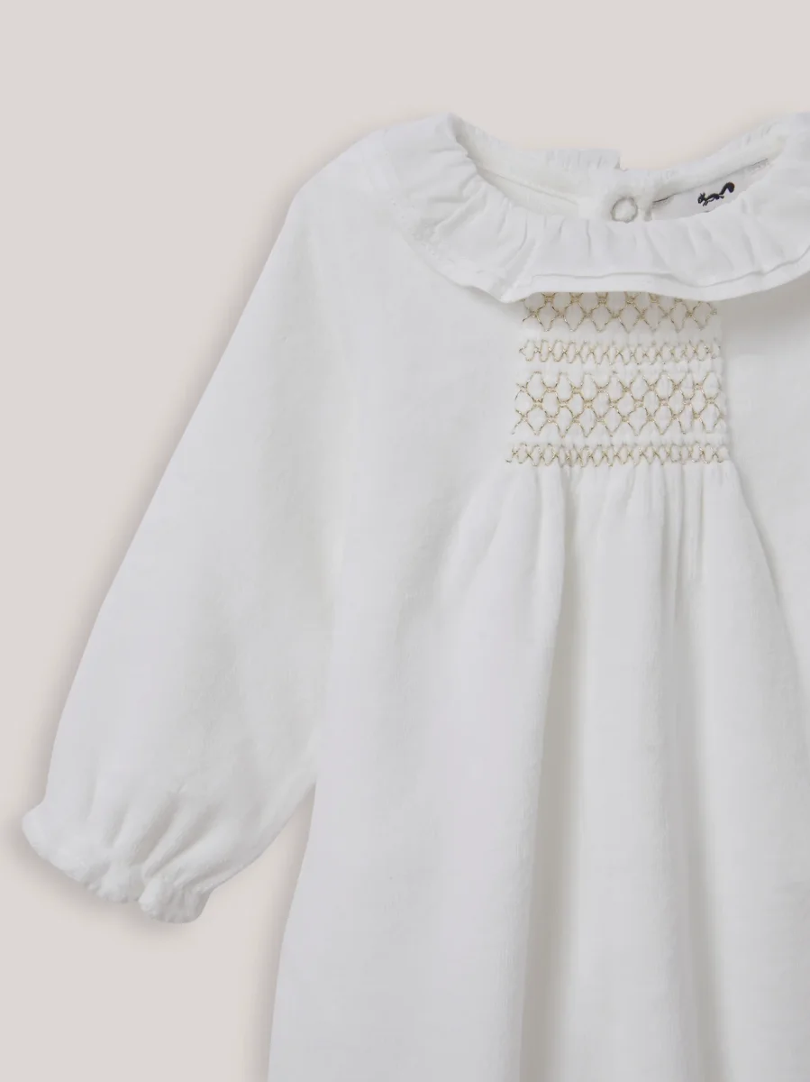 Tellement joli qu’il ne se porte pas seulement la nuit ! Collerette travaillée, jeu de smocks dorés et velours tout doux… un dors-bien très raffiné.