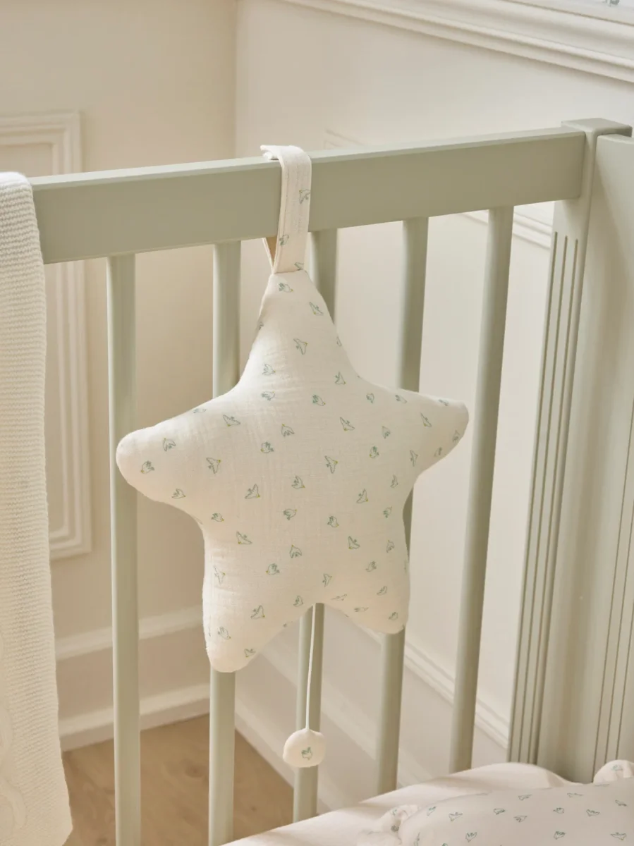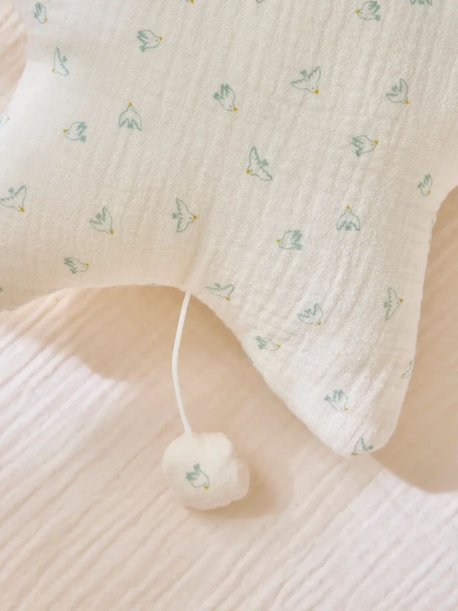Le coussin musical en gaze de coton imprimée est comme la mélodie qu’il joue : doux, léger et adorable. Une belle idée cadeau.