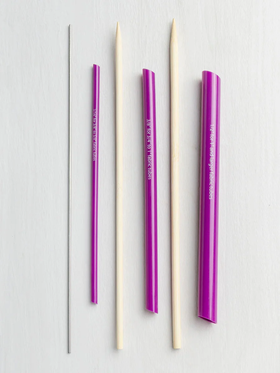 This fabric tube turner set includes three convenient sizes of cylinders and wooden rods used to push and turn fabric tubes: