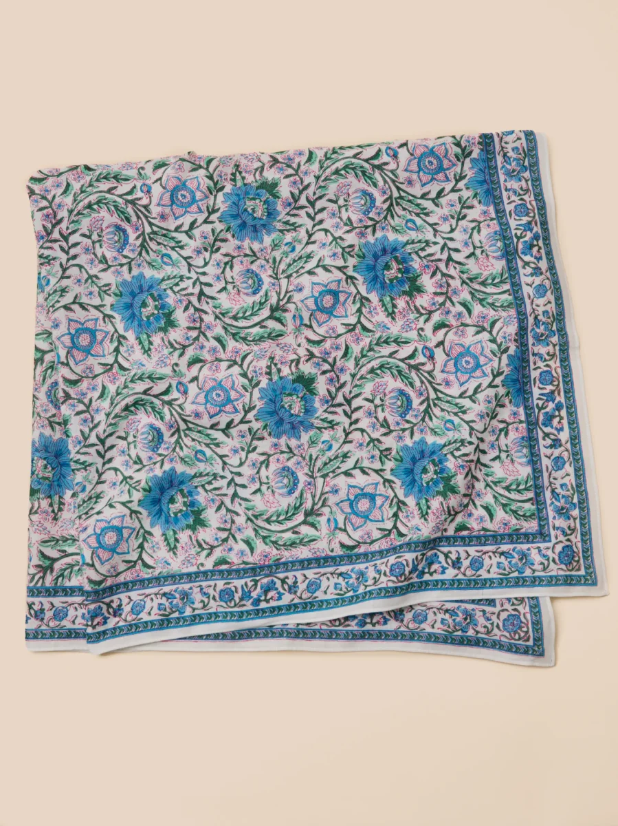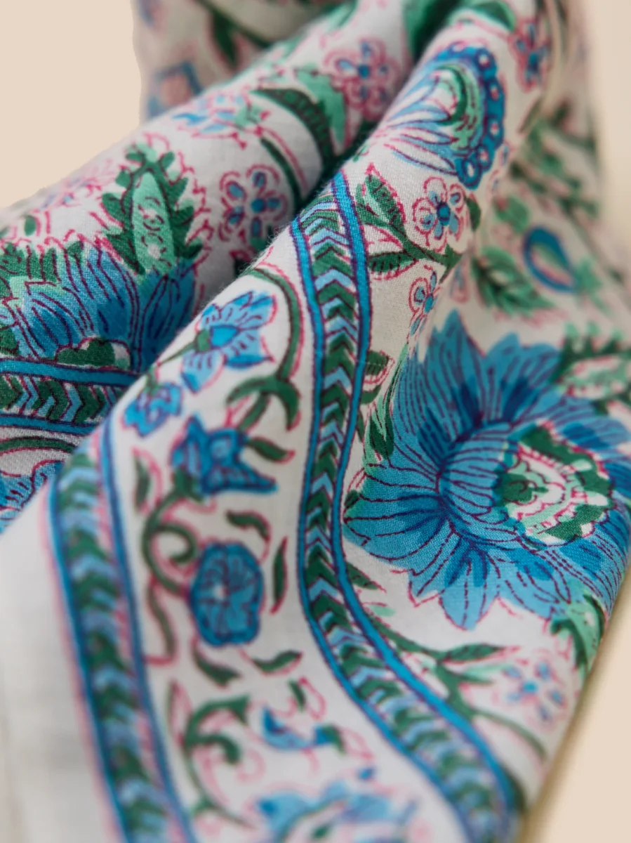 Douce invitation au voyage, le foulard déploie ses arabesques indiennes dans un bleu vibrant, presque électrique. Un accessoire de caractère qui marie héritage et modernité, parfait pour apporter un souffle d’ailleurs et une fraîcheur éclatante aux silhouettes urbaines.