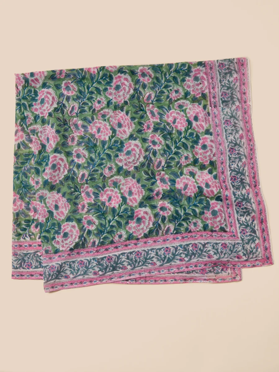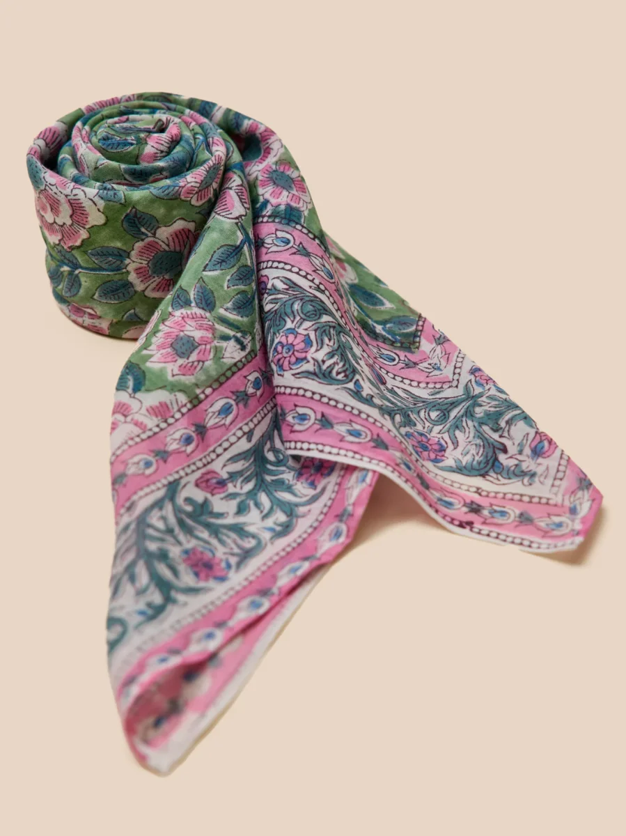 Mariant la fraîcheur d’un vert végétal à la vibration de touches roses, ce foulard à l’imprimé minutieux insuffle un esprit bohème au vestiaire urbain. Un petit bijou de textile qui réveille les basiques et ponctue la saison d’une énergie chromatique audacieuse. Dimensions : 100 x 100 cm environ