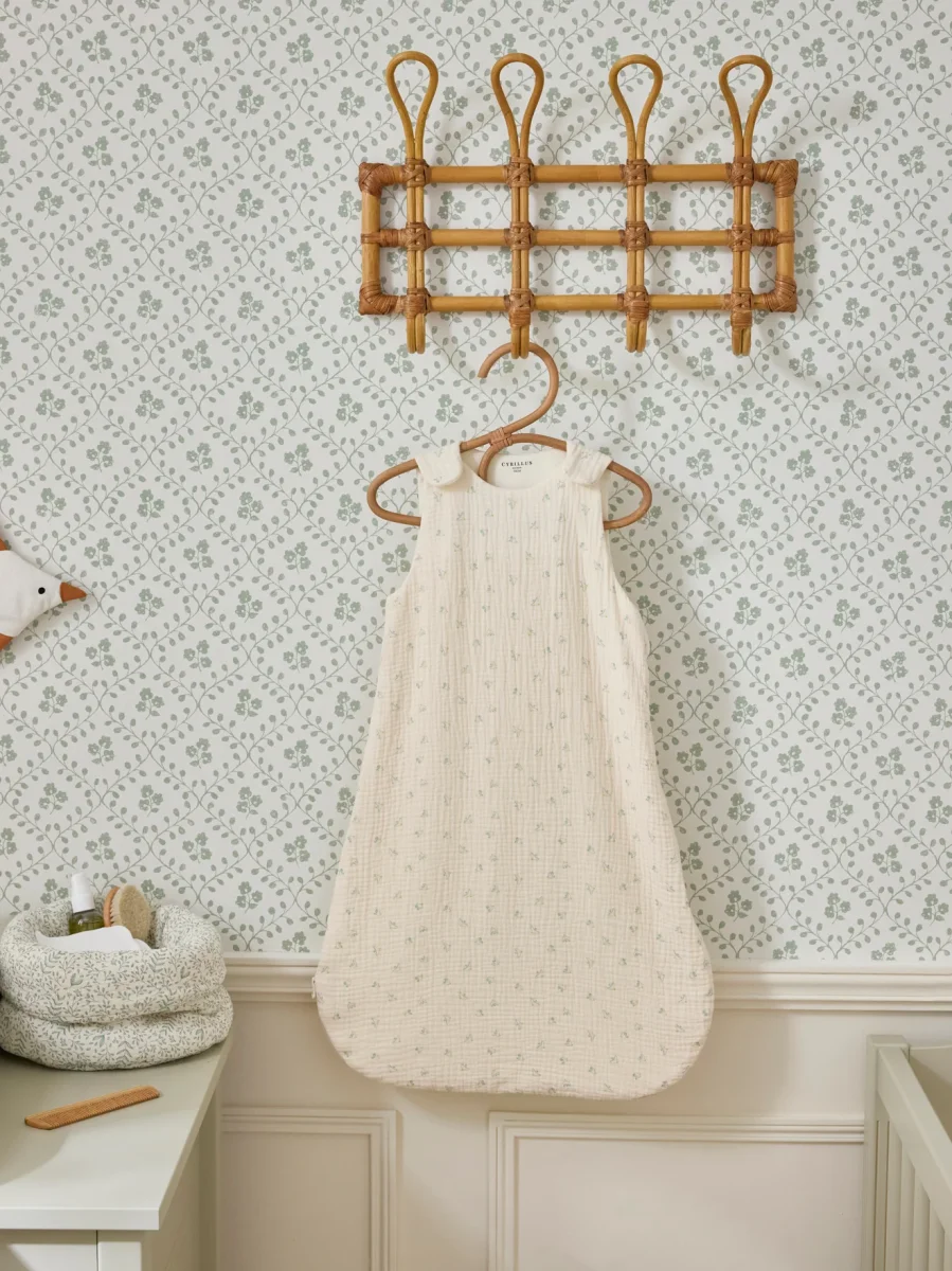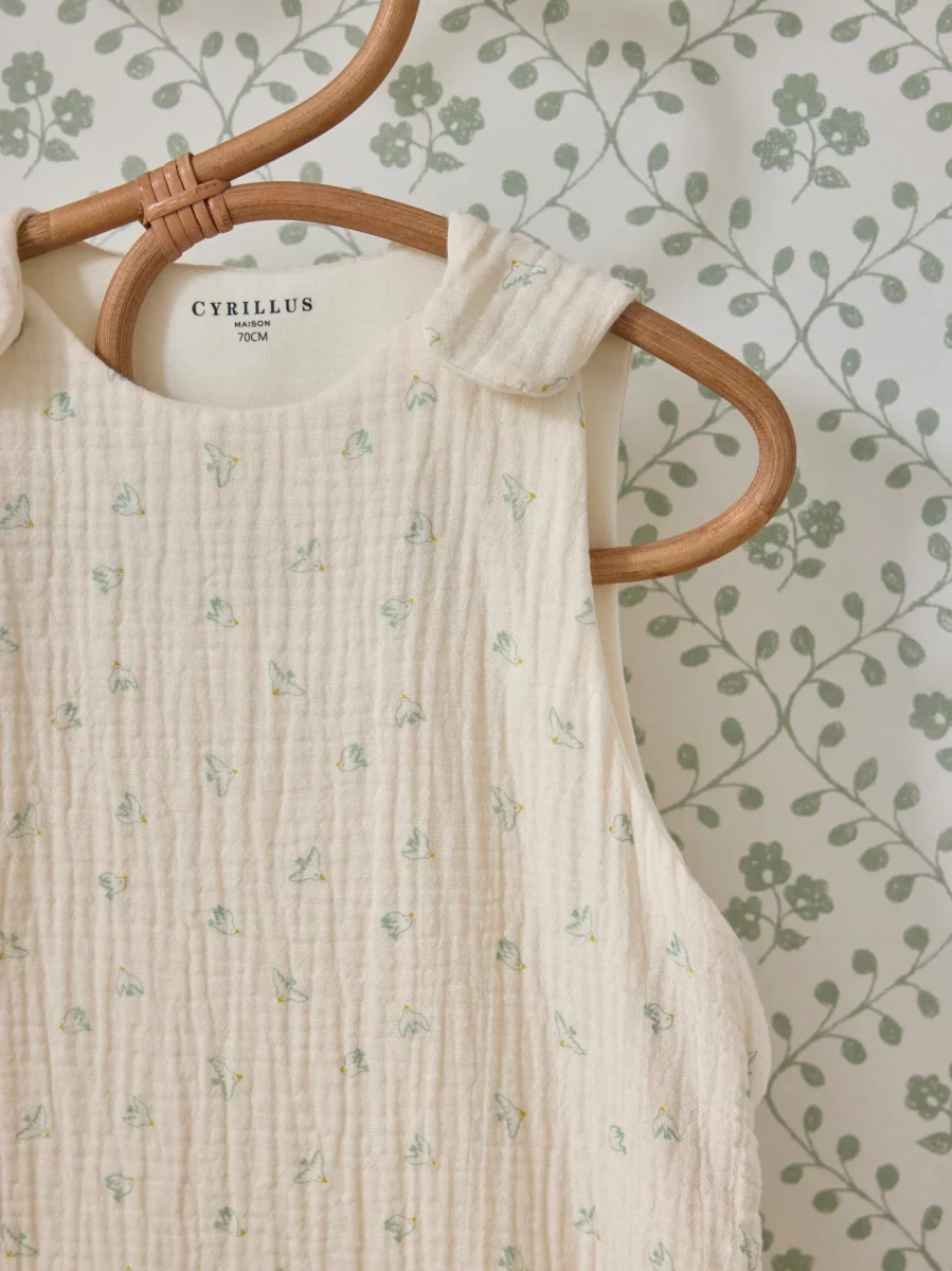 Gigoteuse en gaze de coton bio couleur ivoire recouverte de petites hirondelles vertes. Indice de CHALEUR 1 (TOG 1) : indice idéal en été ou dans une chambre dont la température se situe entre 22 et 24 degrés.