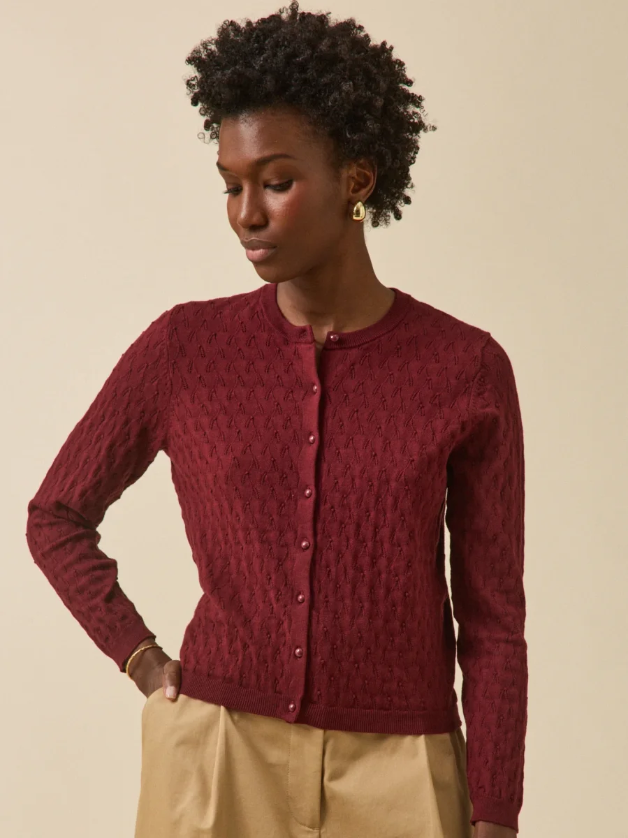 La maille pointelle se réinvente dans une version contemporaine. À porter comme un pull, ce gilet exalte douceur et caractère pour signer une allure féminine d’une grande finesse. Patte de boutonnage, manches longues, finitions bord-côtes ; long. dos 55 cm (en taille S)