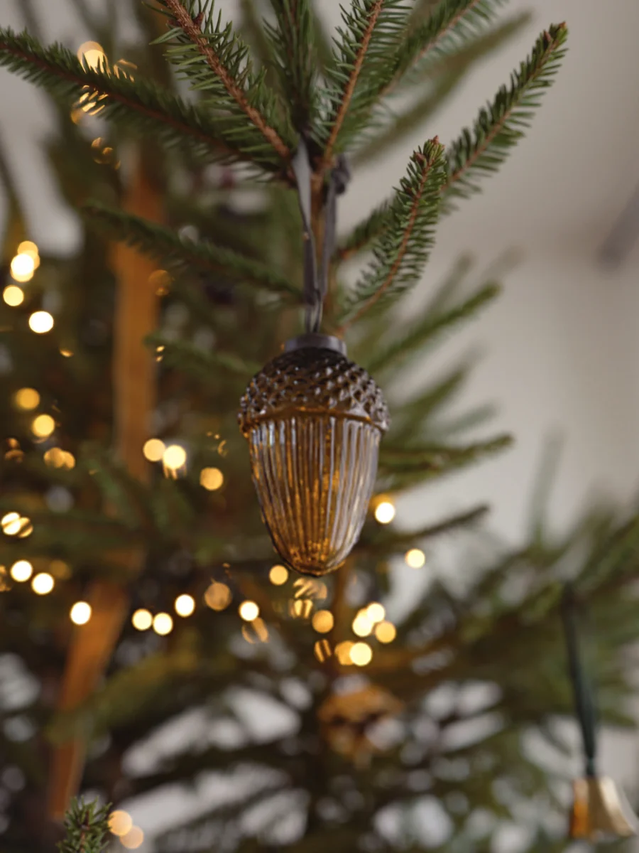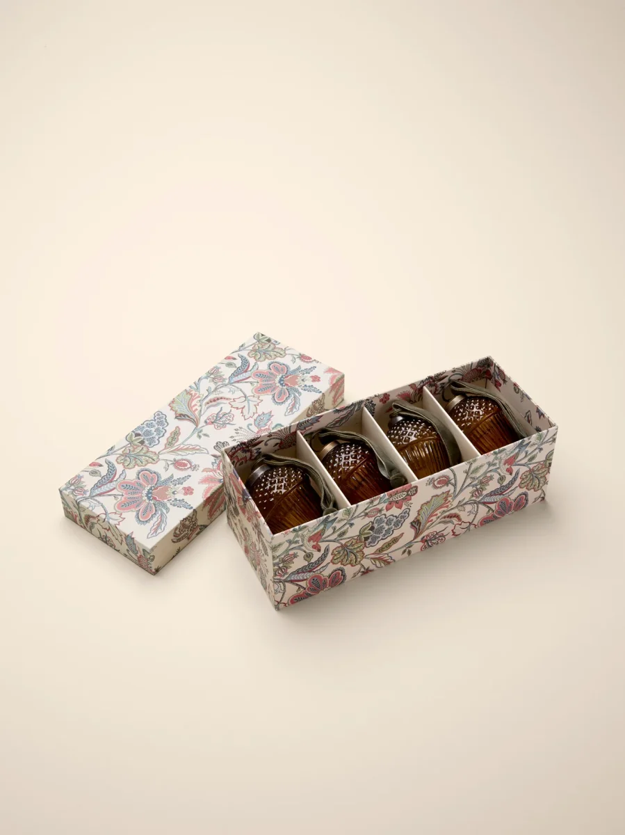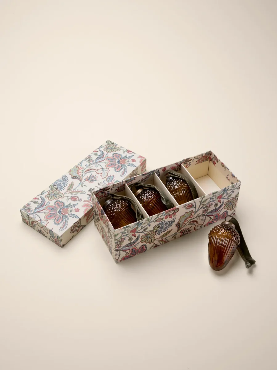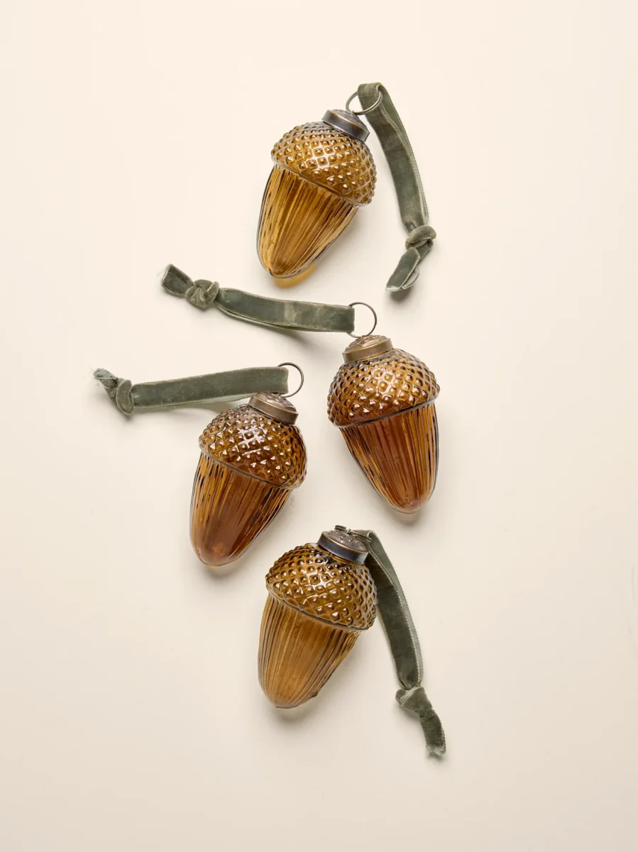 Lot de 4 décorations de Noël en forme de gland confectionnées en verre teinté coloris caramel. Ruban de suspension en velours coloris bordeaux. Décorations fabriquées en Inde de façon artisanale, livrées dans une jolie boîte en papier recouvert de notre imprimé exclusif de Noël.
