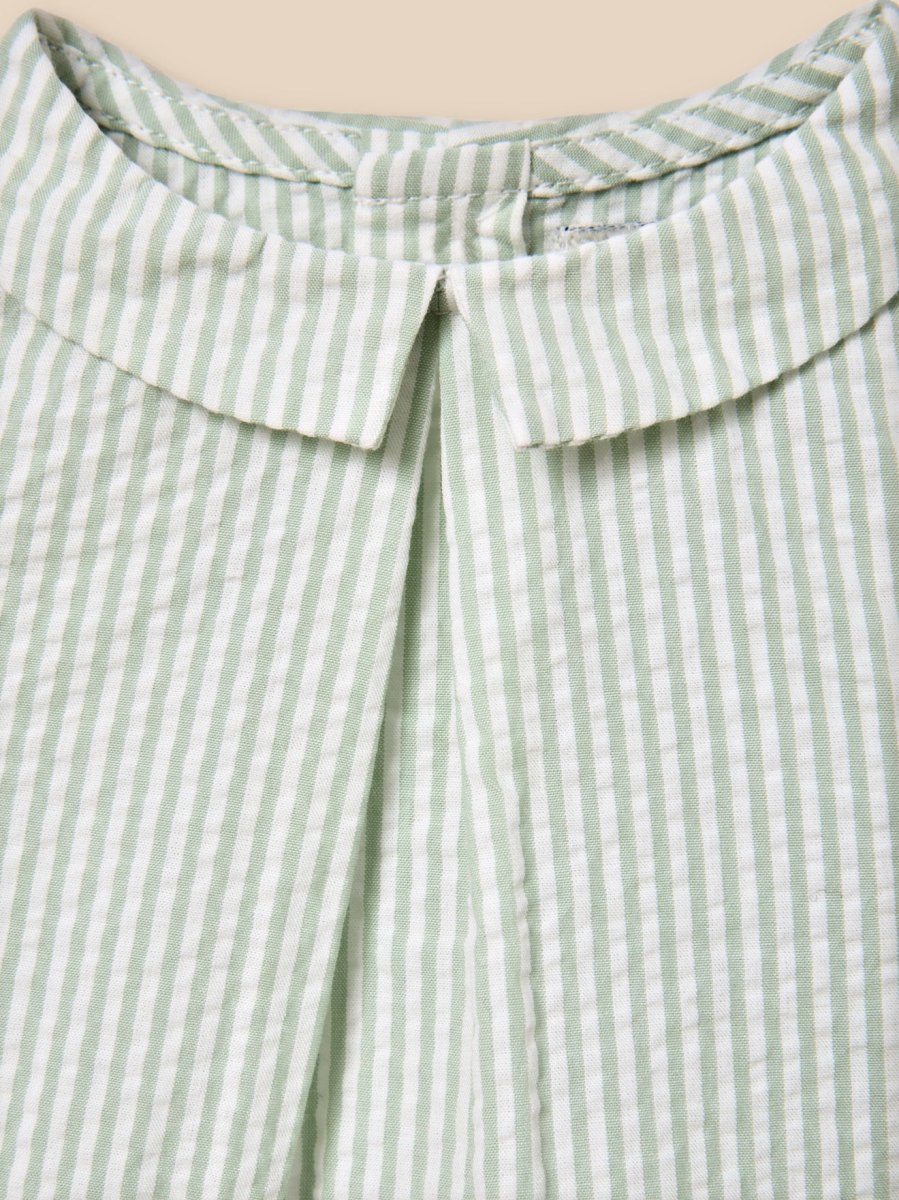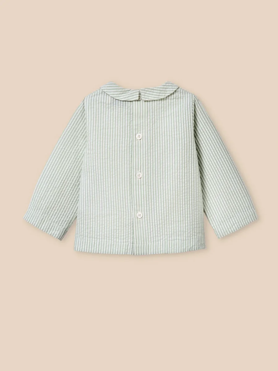 Une fine rayure qui met de l’élégance dans le vestiaire de bébé. Plis creux sous le col chemise Ouverture totale au dos par boutons Fente sur les côtés. Monogramme brodé à la base