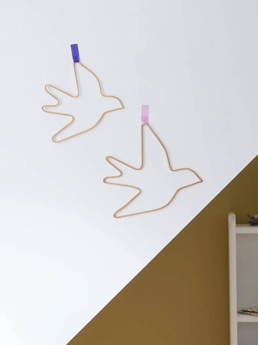 2 hirondelles fines et dorées pour habiller avec poésie un mur ou une porte. Création issue de l’artisanat indien. Se fixe simplement à l’aide d’un petit clou ou d’un morceau de ruban adhésif. Lot de 2 hirondelles de 2 tailles différentes : 17 x 17,5 cm et 21 x 21 cm env.