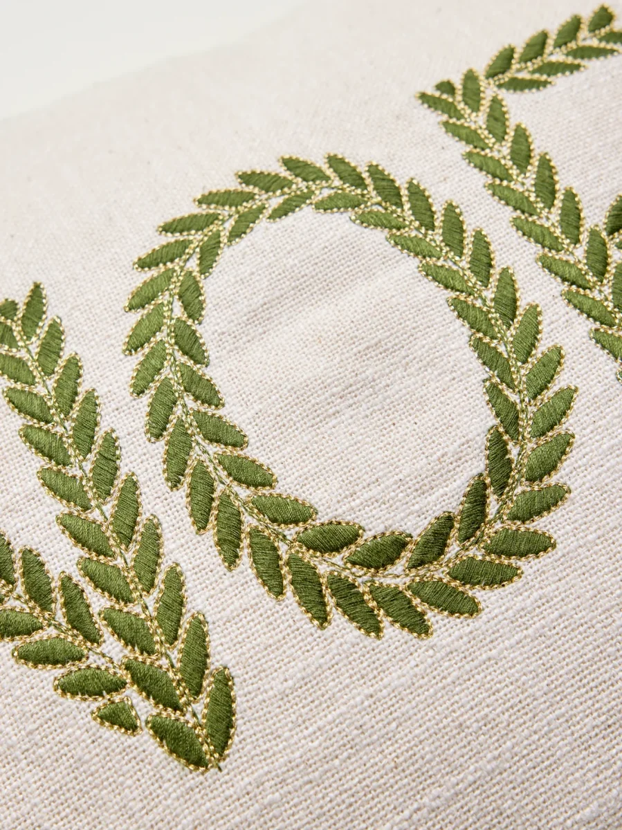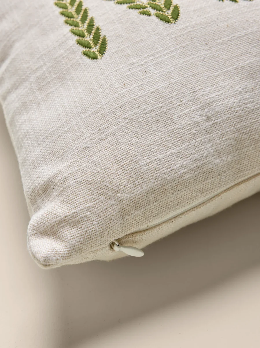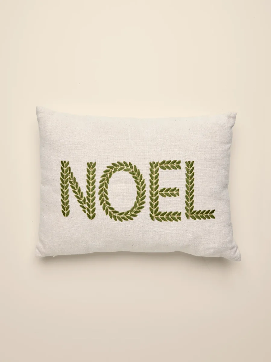 Housse de coussin en coton structuré. Broderie NOEL : les lettres sont formées par des petites feuilles brodées et bordées de fil doré. Fermeture par glissière invisible. Dos uni.