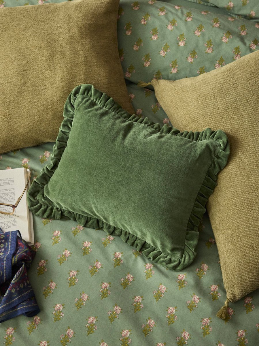 Charme, douceur et fantaisie. Housse de coussin en velours ras avec contours volantés et glissière invisible au dos.