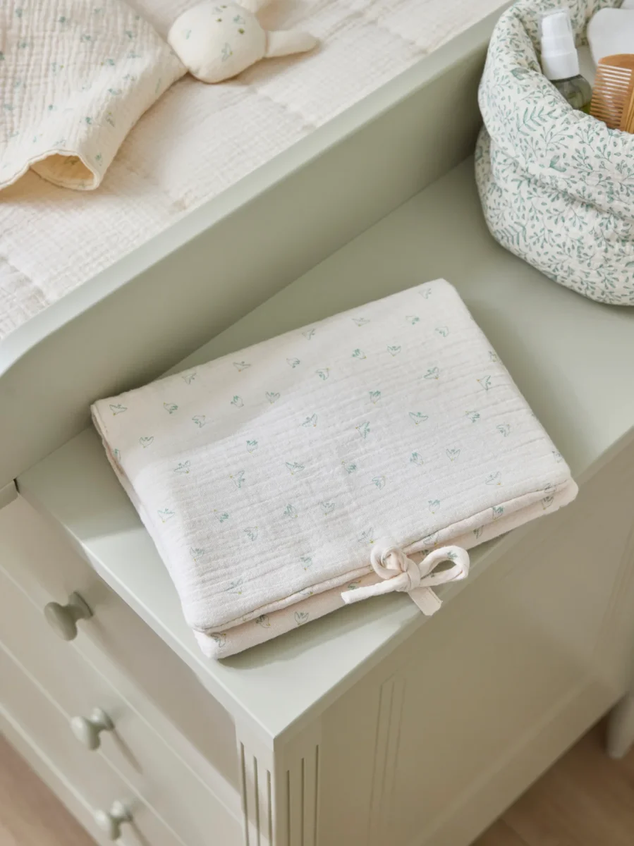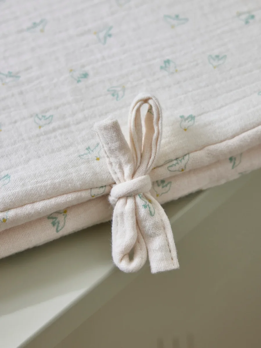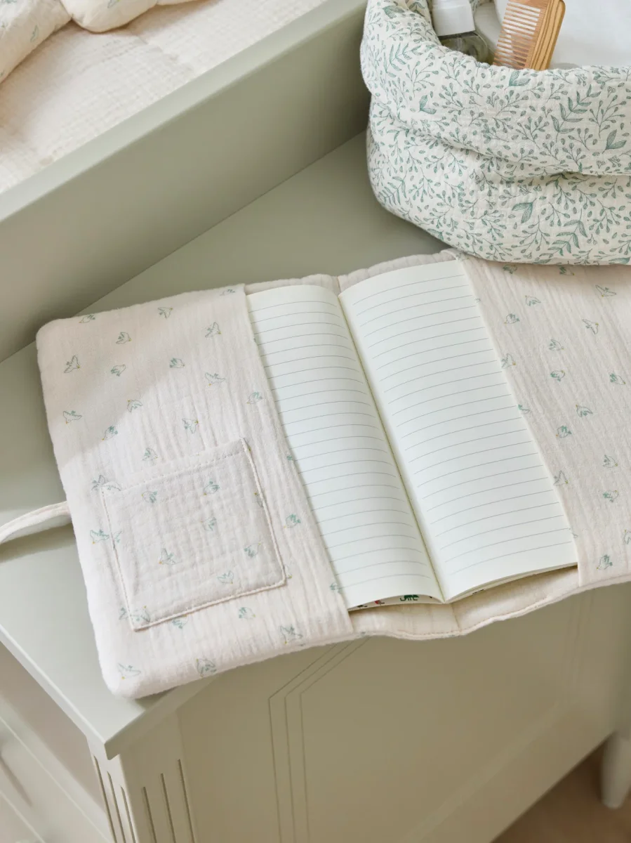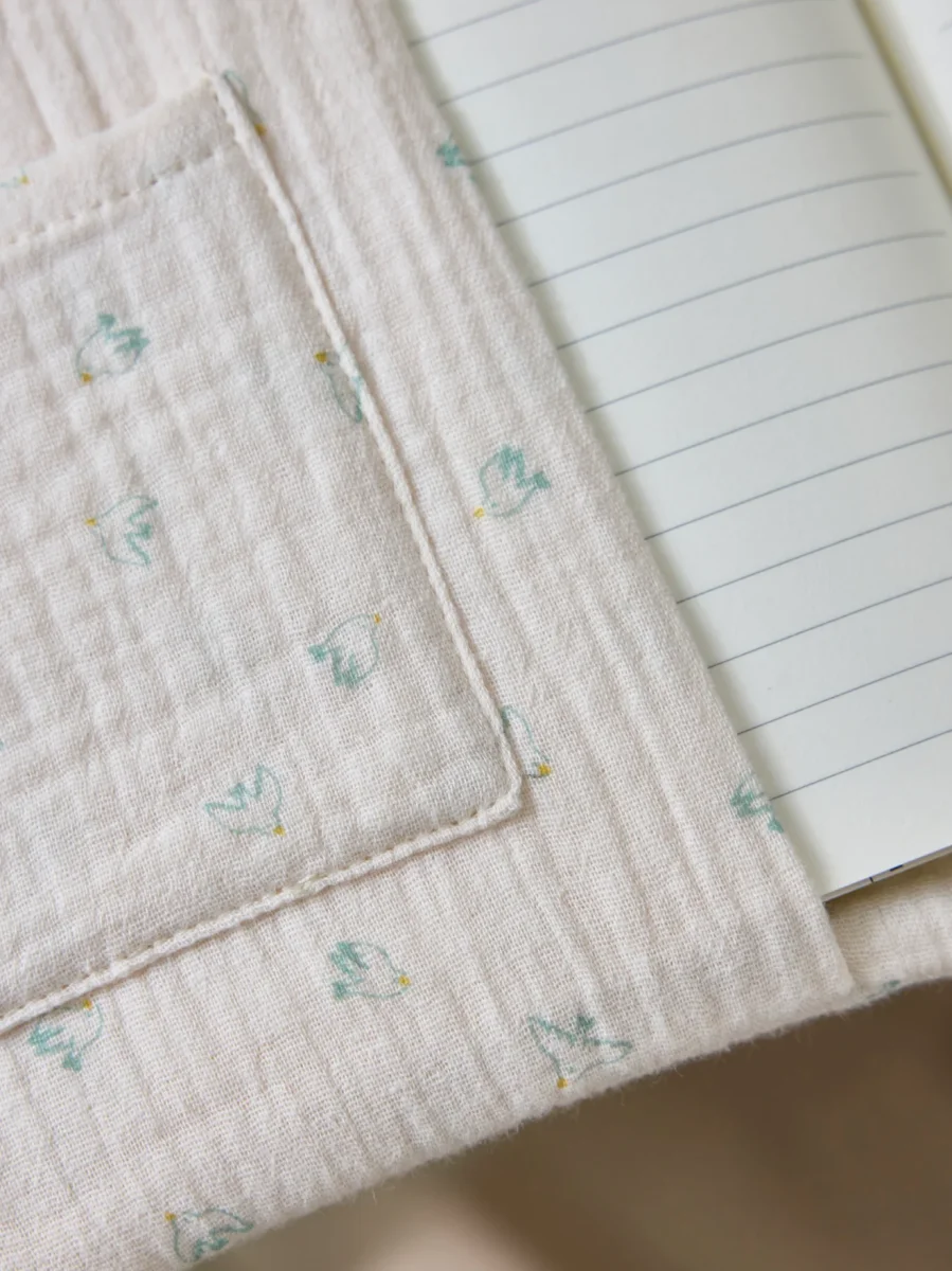 Protège carnet de santé en gaze de coton molletonnée recouverte de petites hirondelles. Avec petite poche plaquée à l’intérieur et liens de fermeture.