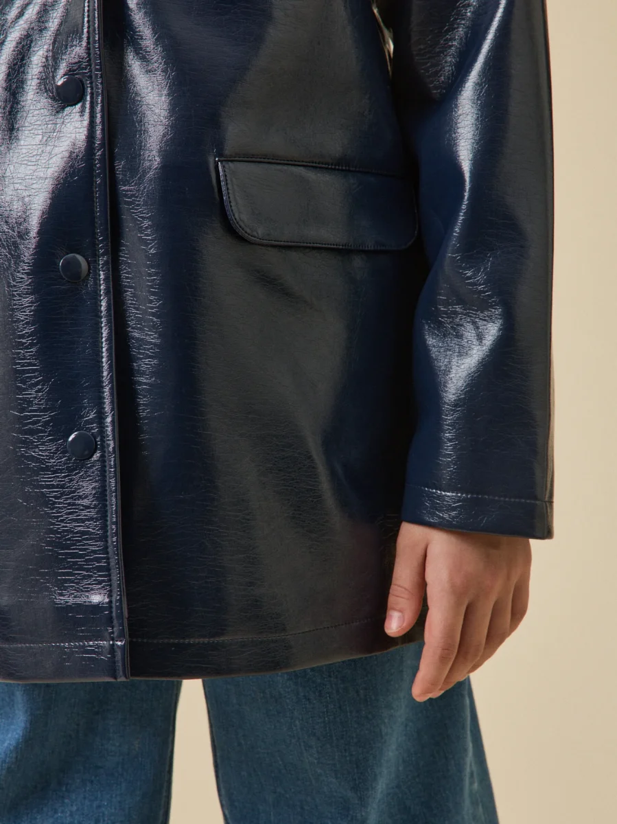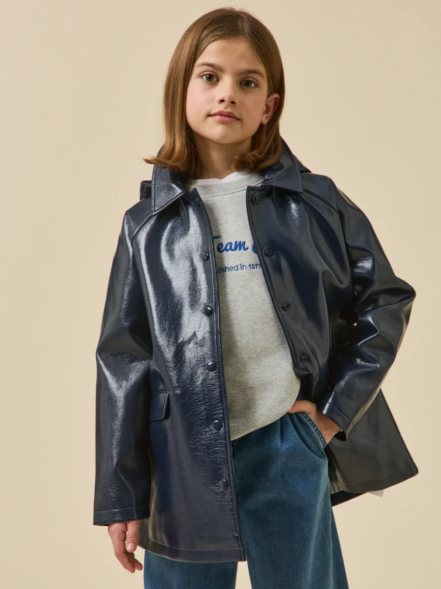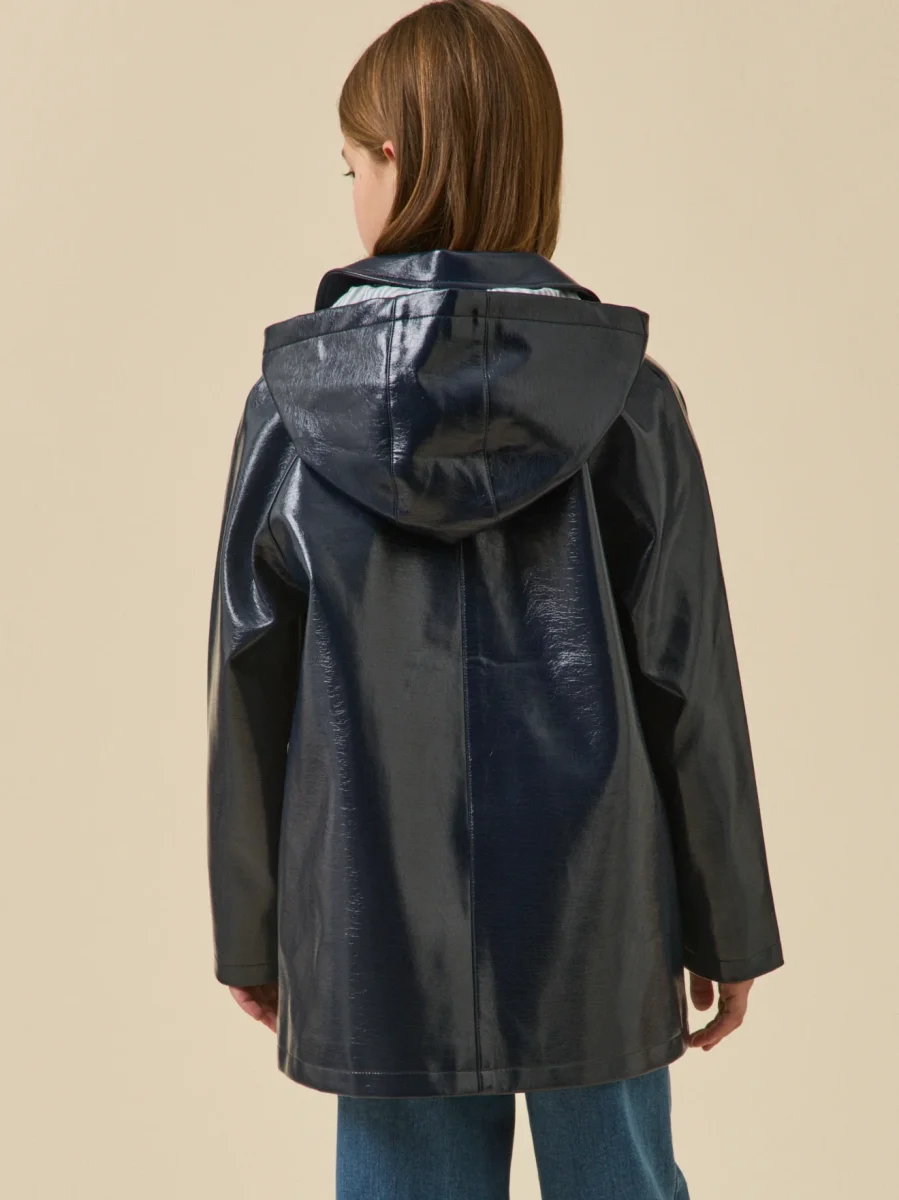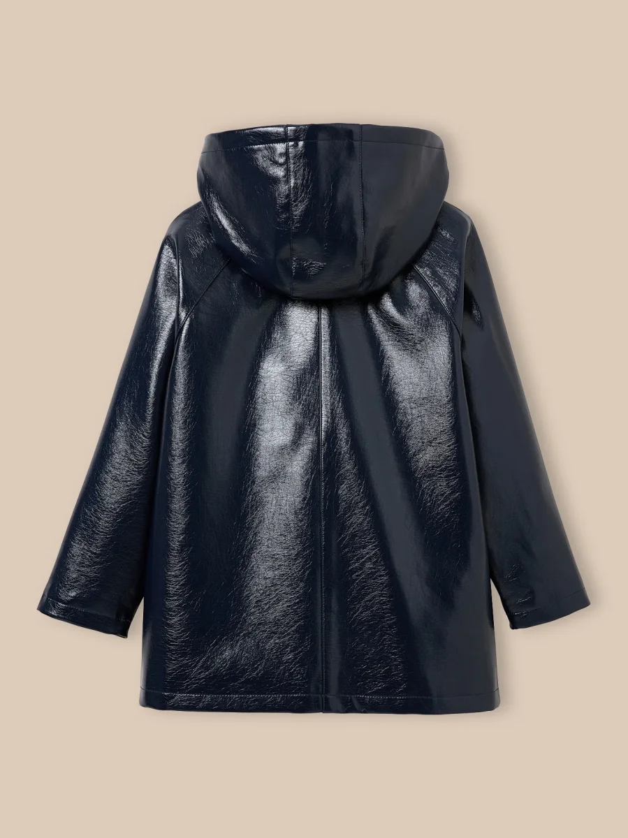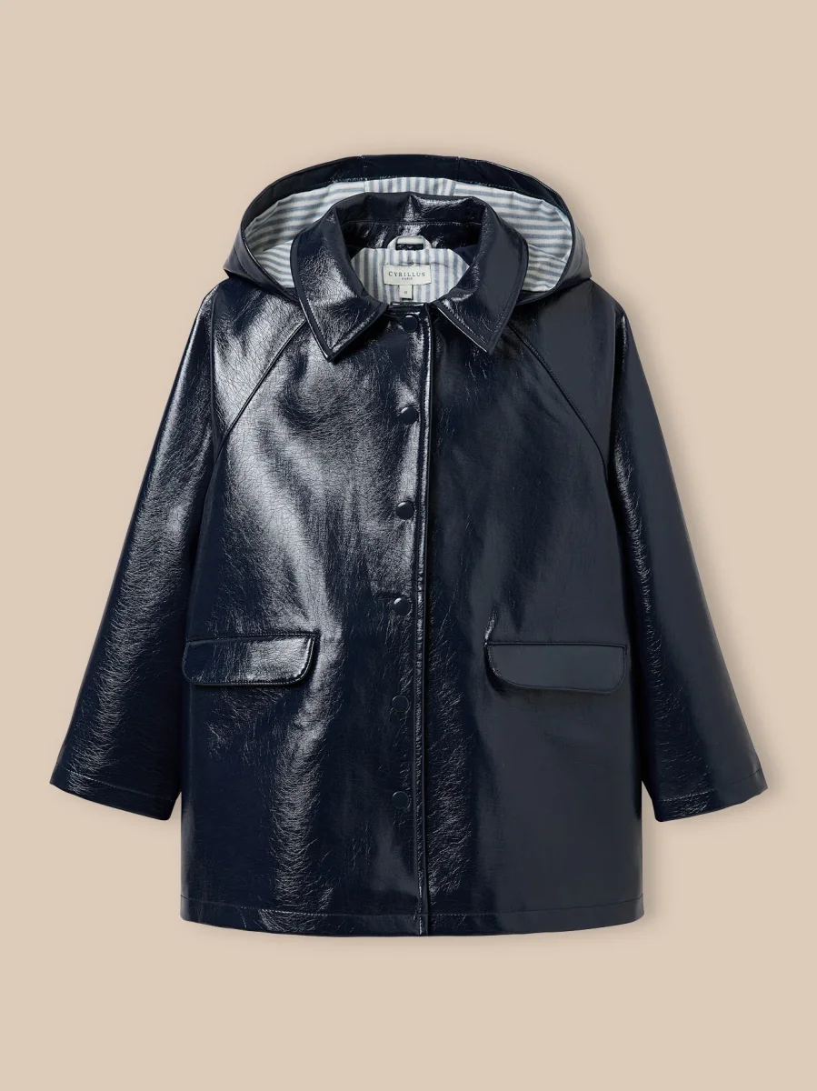 Grand retour du vinyle : un imperméable confortable et pratique, doté d’une capuche amovible.