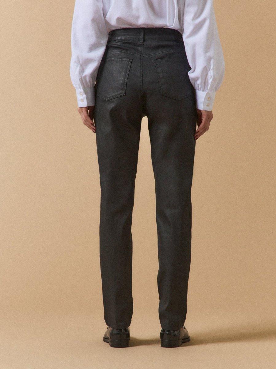 Coupe slim et belle matière enduite au confort extensible. Cet essentiel du dressing allonge la silhouette et se porte facilement quelle que soit l’occasion.